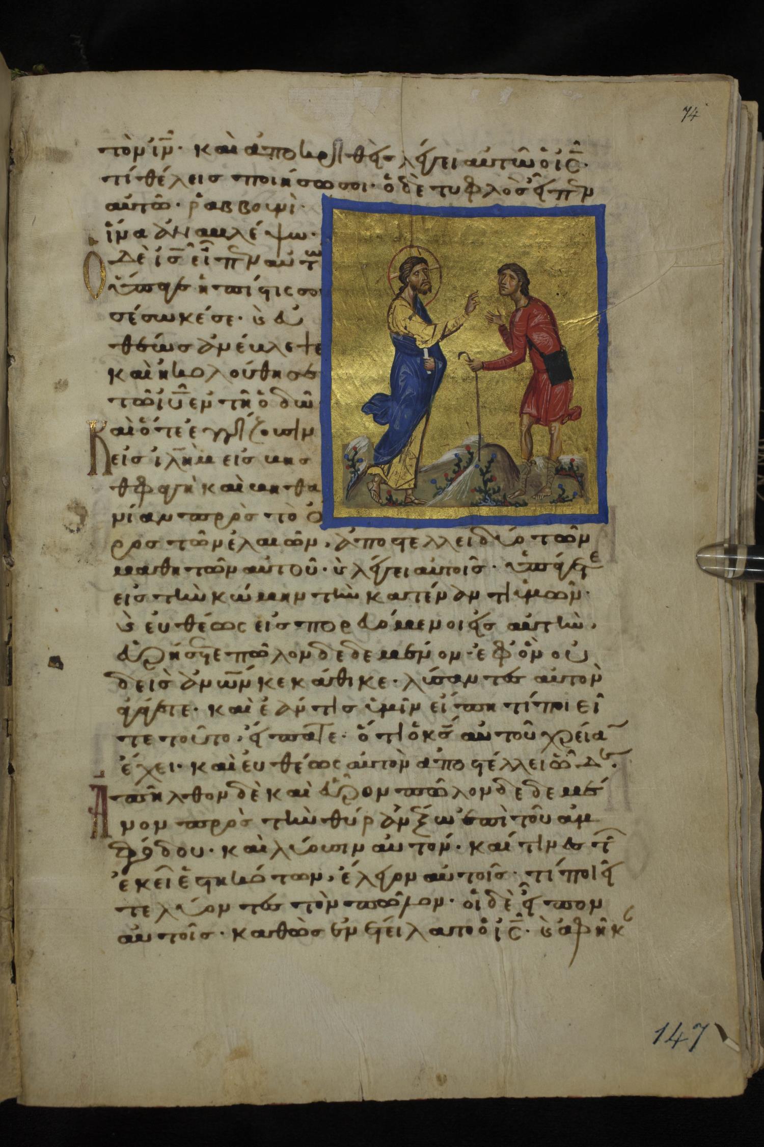 Twelfth century minuscule of the Gospels on parchment; 185 leaves, 1 column, 29 lines per column. Images were taken at the National Library of Greece in Athens.