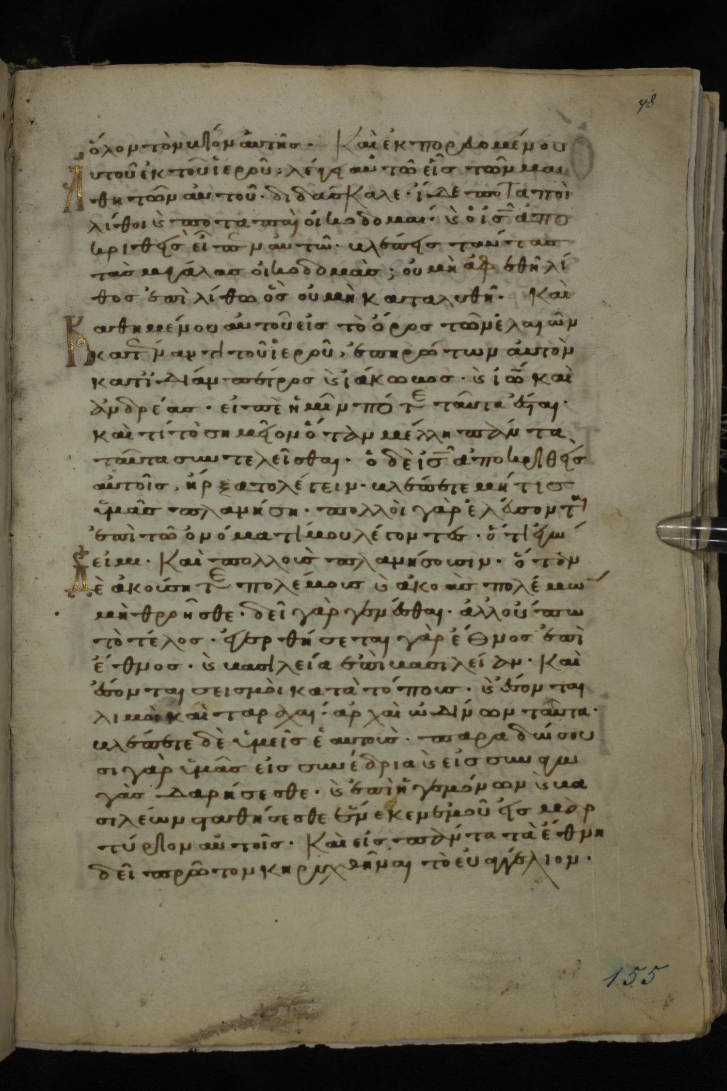 Twelfth century minuscule of the Gospels on parchment; 185 leaves, 1 column, 29 lines per column. Images were taken at the National Library of Greece in Athens.