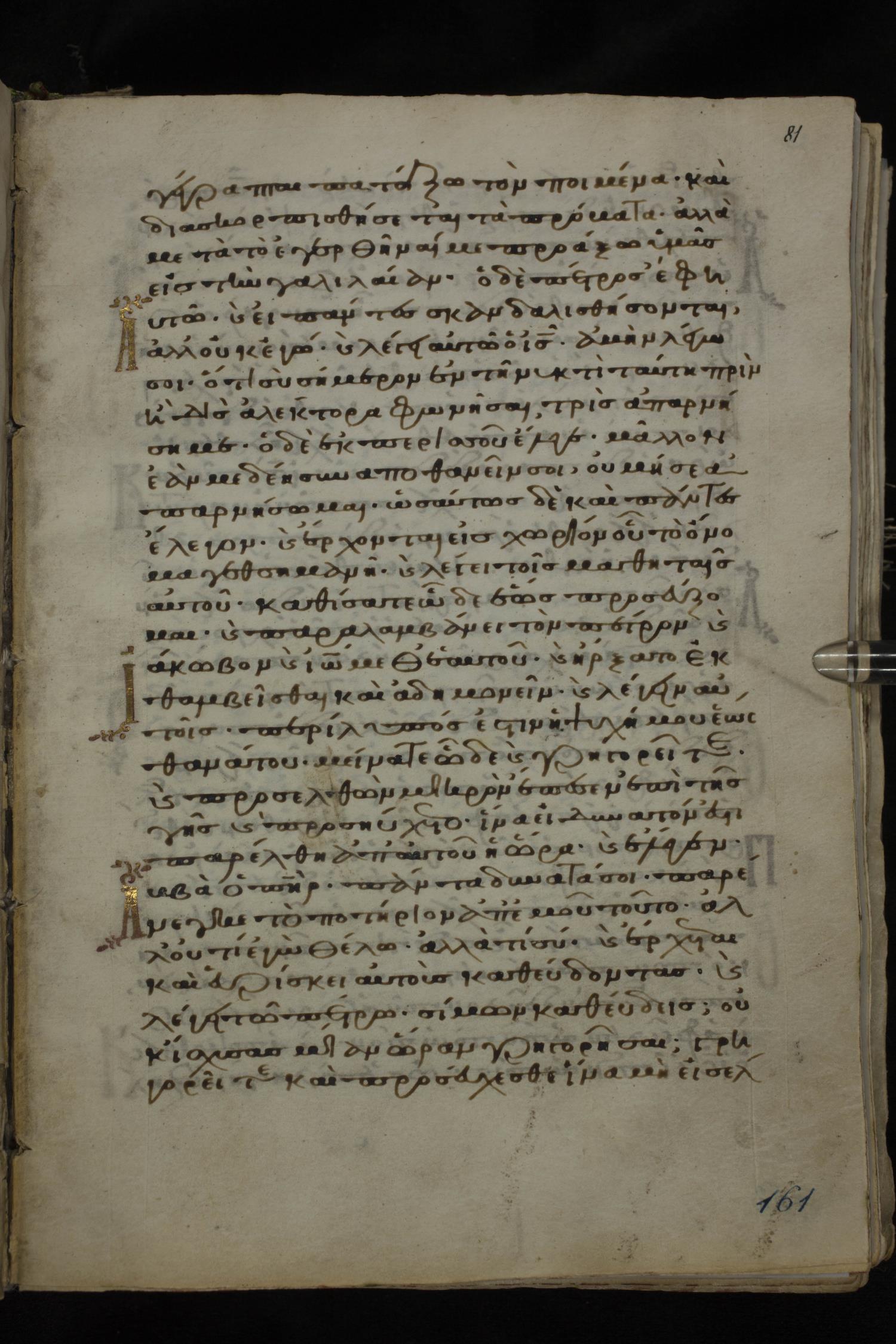 Twelfth century minuscule of the Gospels on parchment; 185 leaves, 1 column, 29 lines per column. Images were taken at the National Library of Greece in Athens.