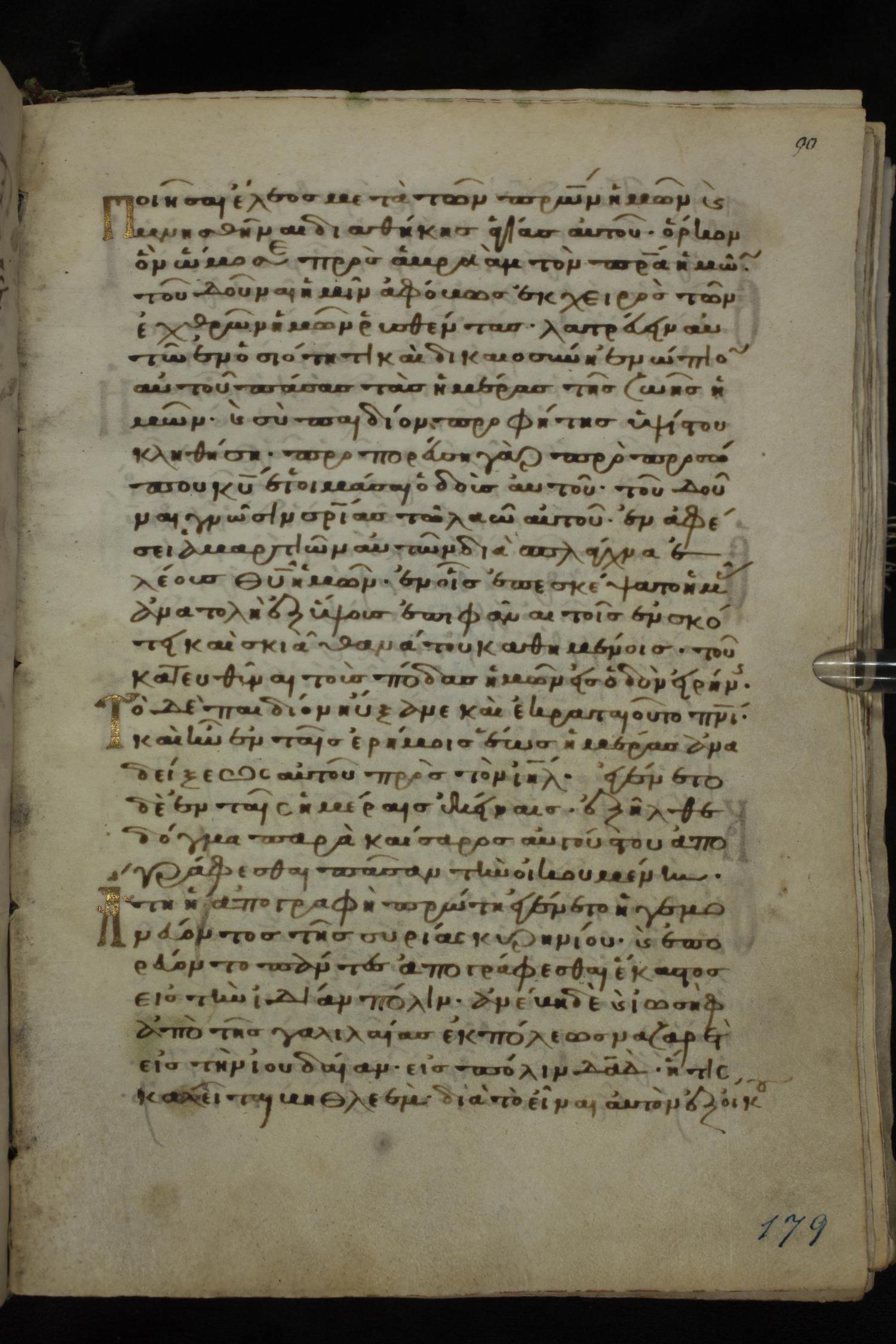 Twelfth century minuscule of the Gospels on parchment; 185 leaves, 1 column, 29 lines per column. Images were taken at the National Library of Greece in Athens.