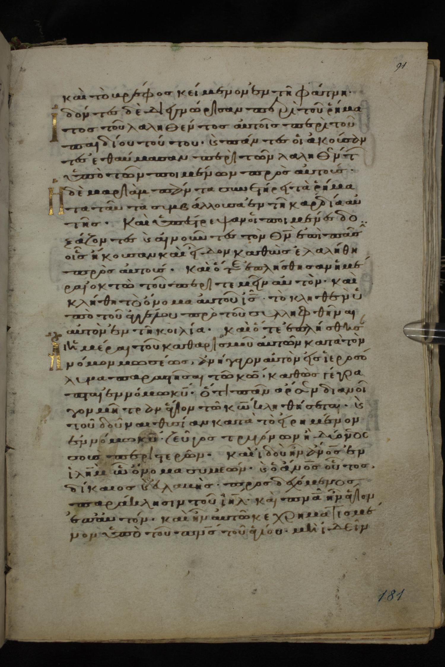 Twelfth century minuscule of the Gospels on parchment; 185 leaves, 1 column, 29 lines per column. Images were taken at the National Library of Greece in Athens.