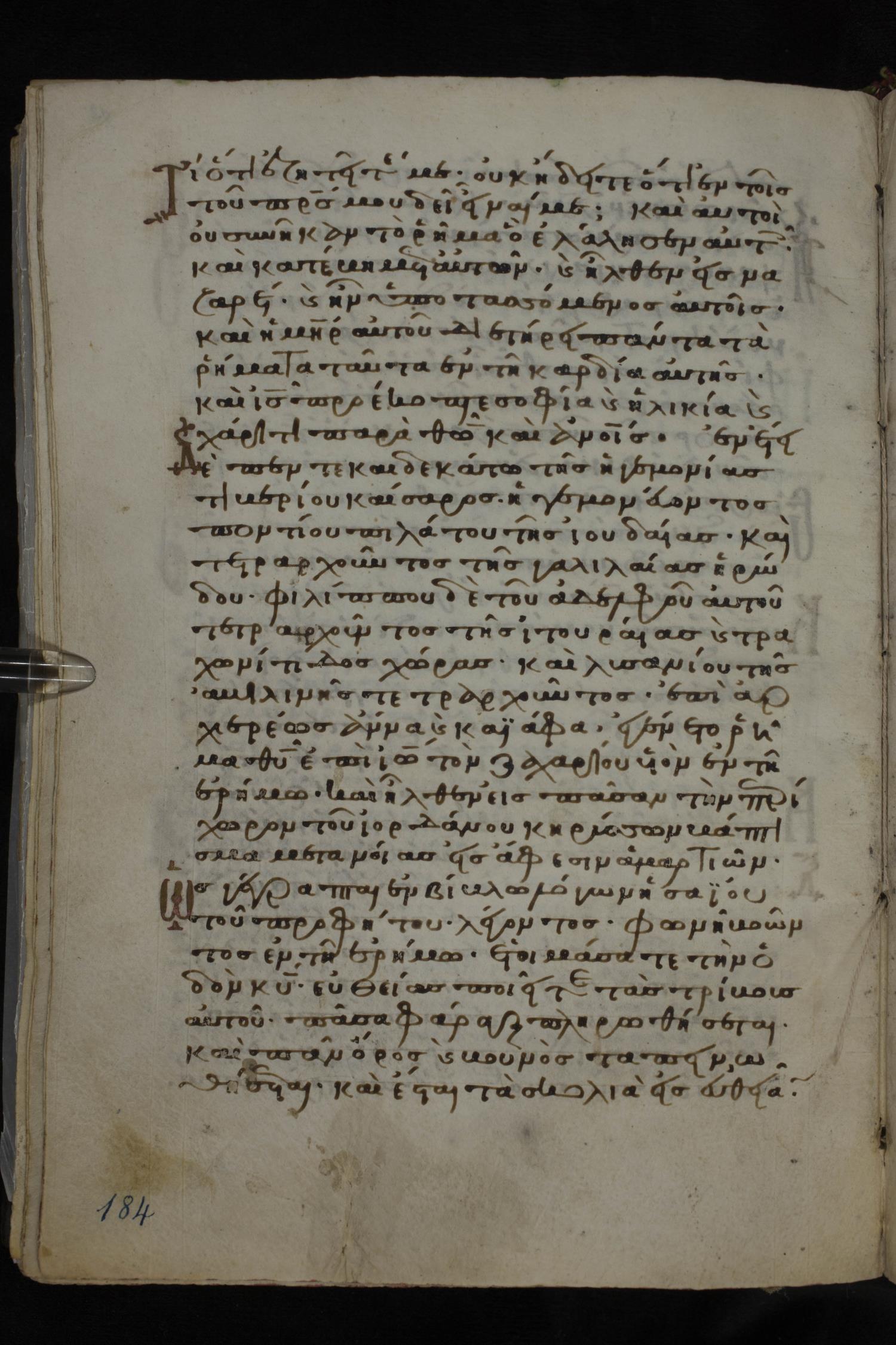 Twelfth century minuscule of the Gospels on parchment; 185 leaves, 1 column, 29 lines per column. Images were taken at the National Library of Greece in Athens.