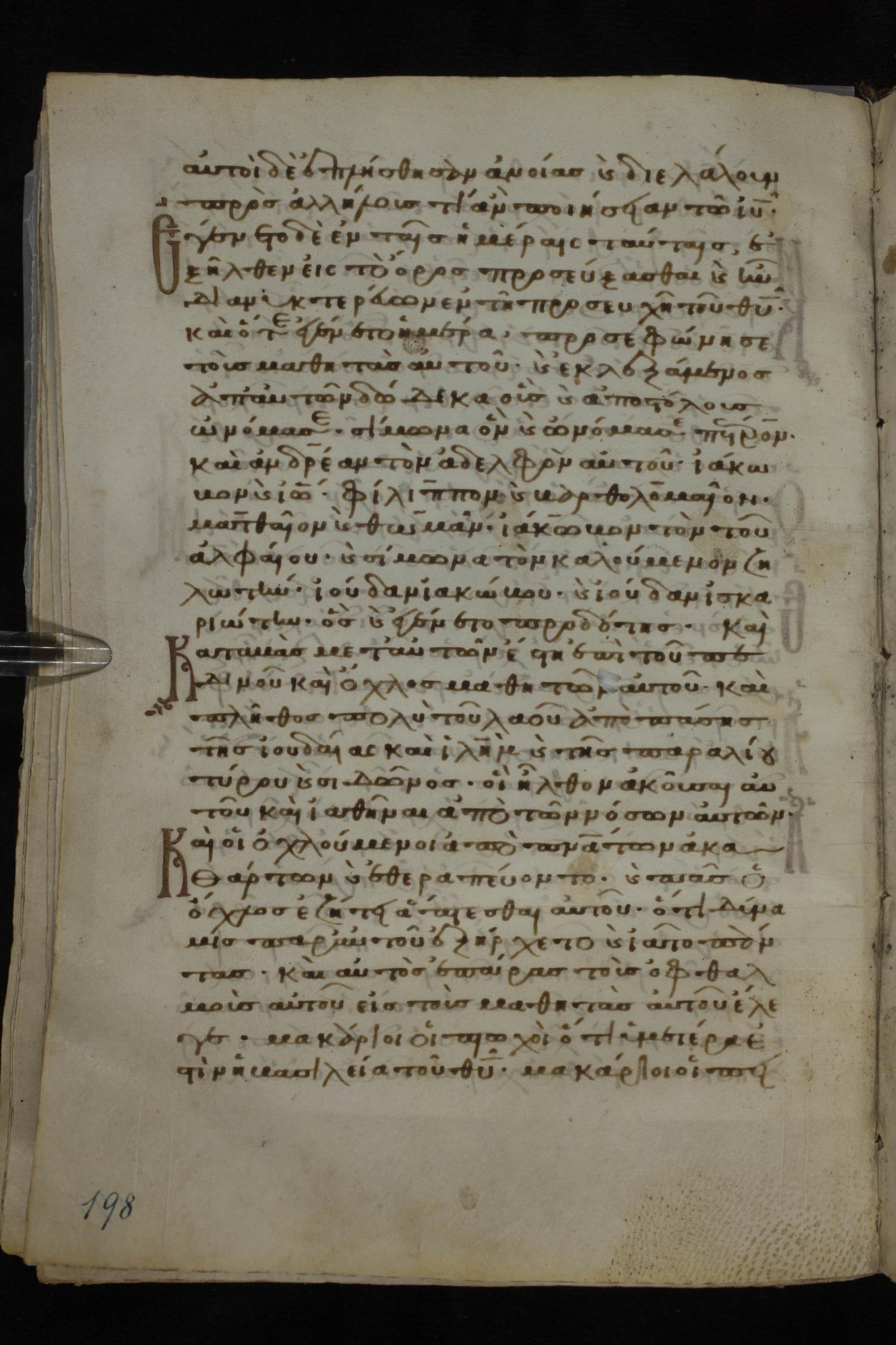 Twelfth century minuscule of the Gospels on parchment; 185 leaves, 1 column, 29 lines per column. Images were taken at the National Library of Greece in Athens.