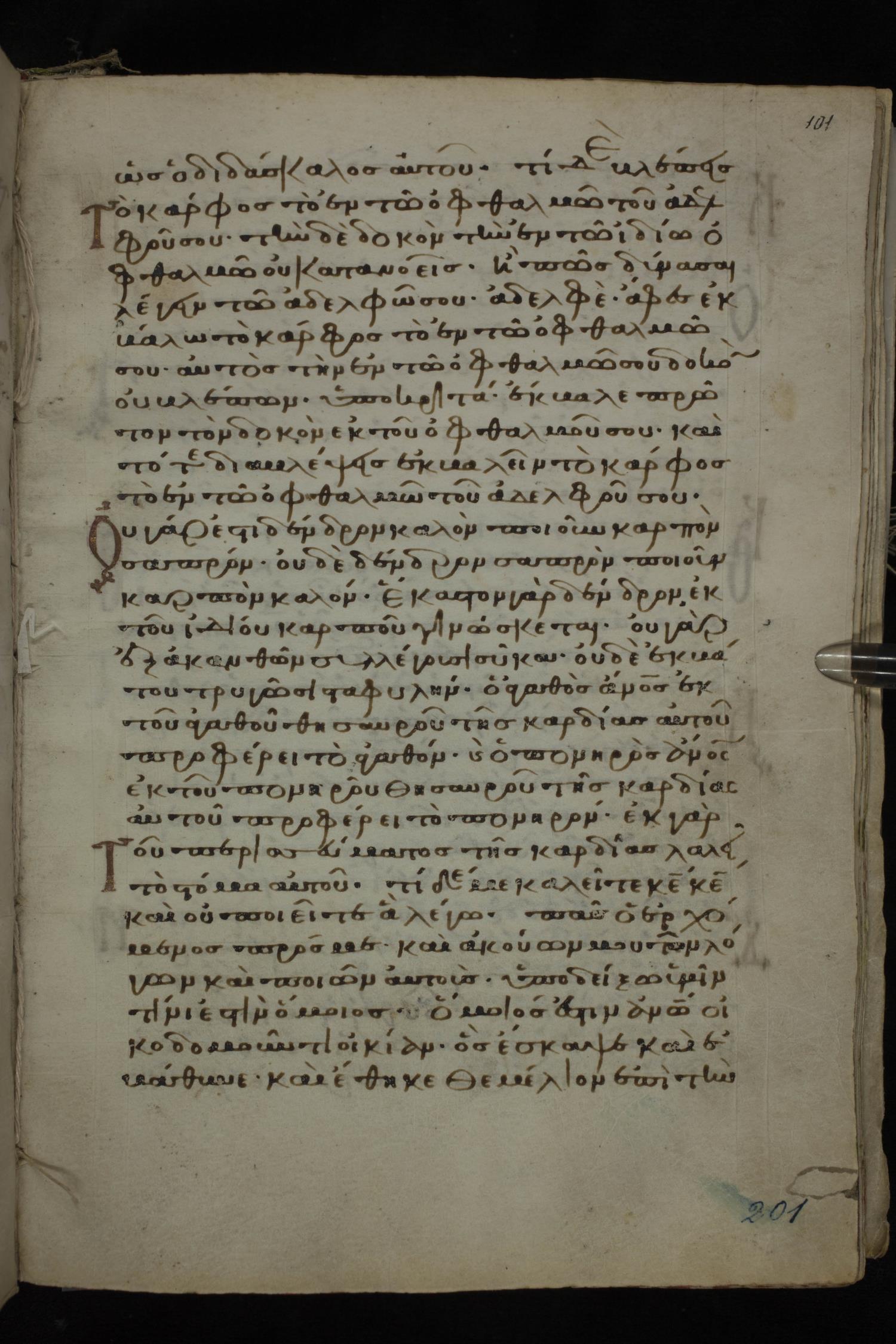 Twelfth century minuscule of the Gospels on parchment; 185 leaves, 1 column, 29 lines per column. Images were taken at the National Library of Greece in Athens.