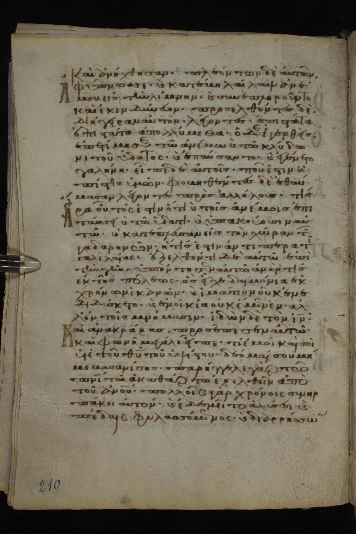 Twelfth century minuscule of the Gospels on parchment; 185 leaves, 1 column, 29 lines per column. Images were taken at the National Library of Greece in Athens.