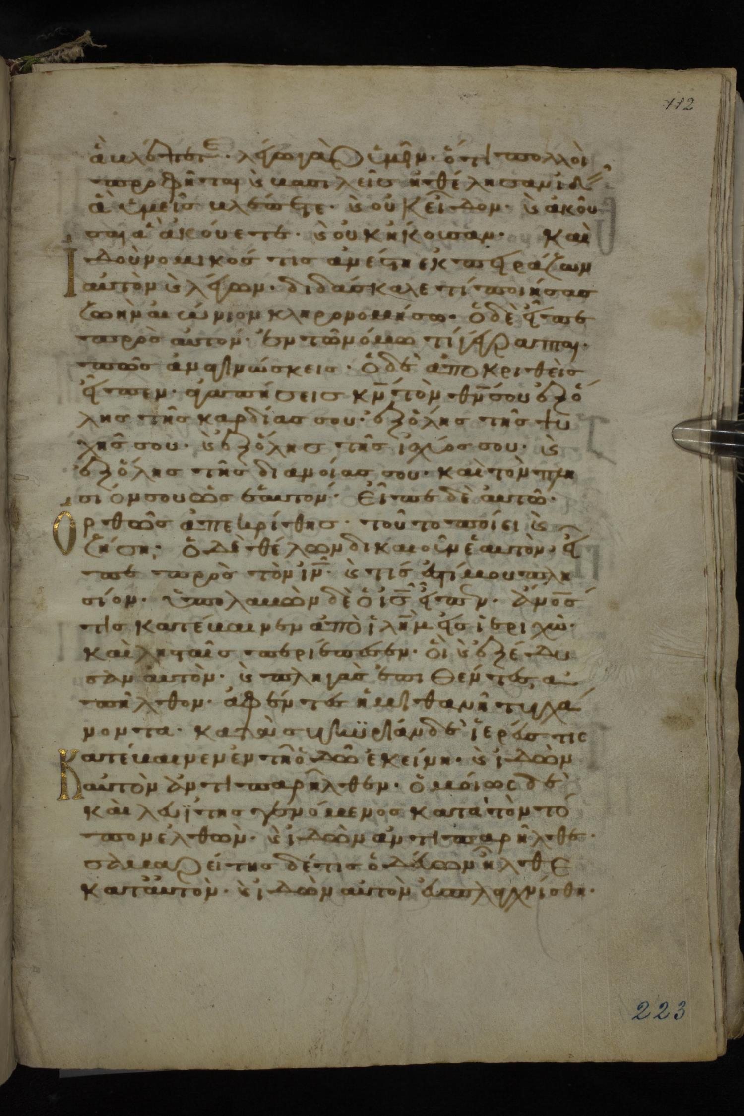 Twelfth century minuscule of the Gospels on parchment; 185 leaves, 1 column, 29 lines per column. Images were taken at the National Library of Greece in Athens.