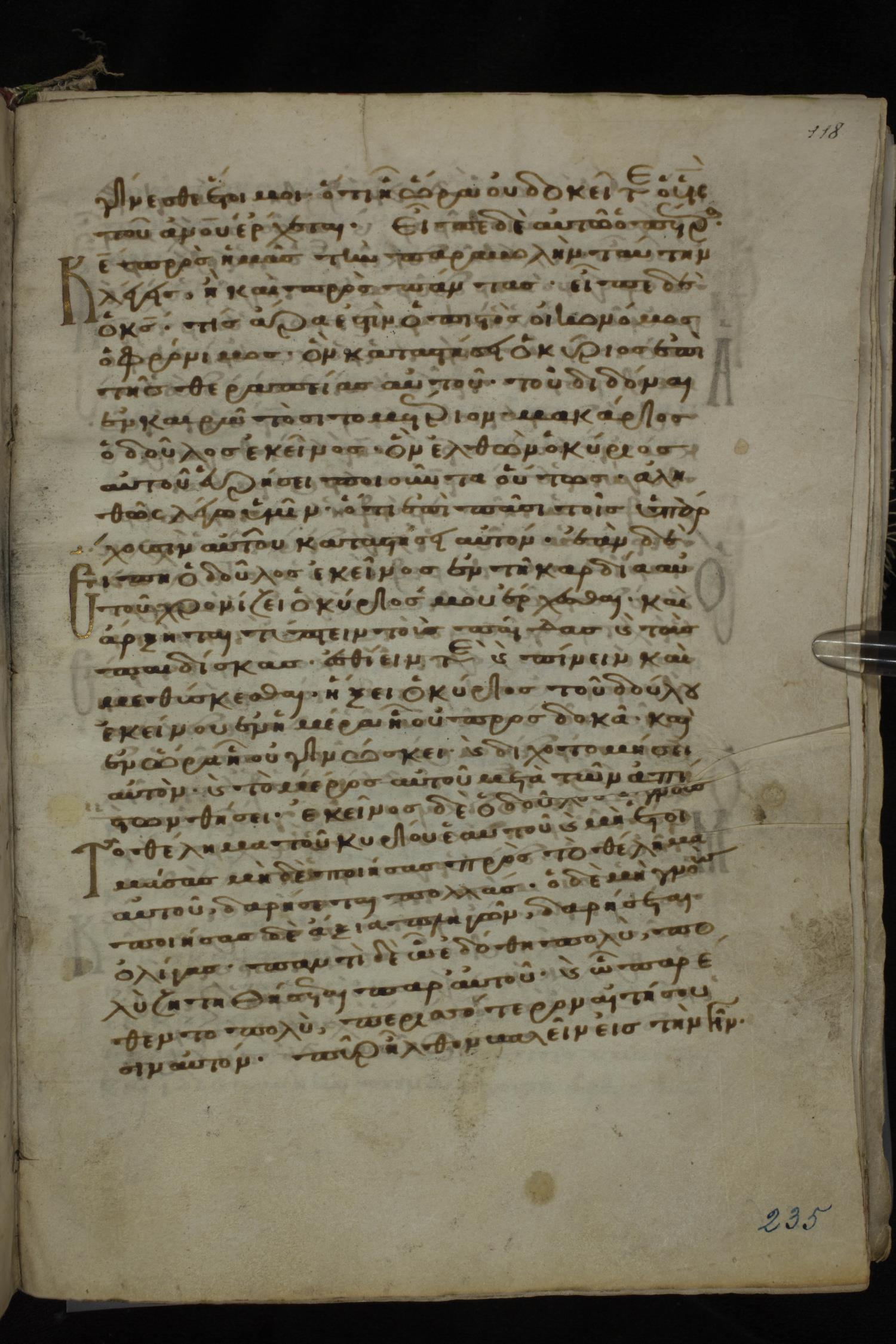 Twelfth century minuscule of the Gospels on parchment; 185 leaves, 1 column, 29 lines per column. Images were taken at the National Library of Greece in Athens.