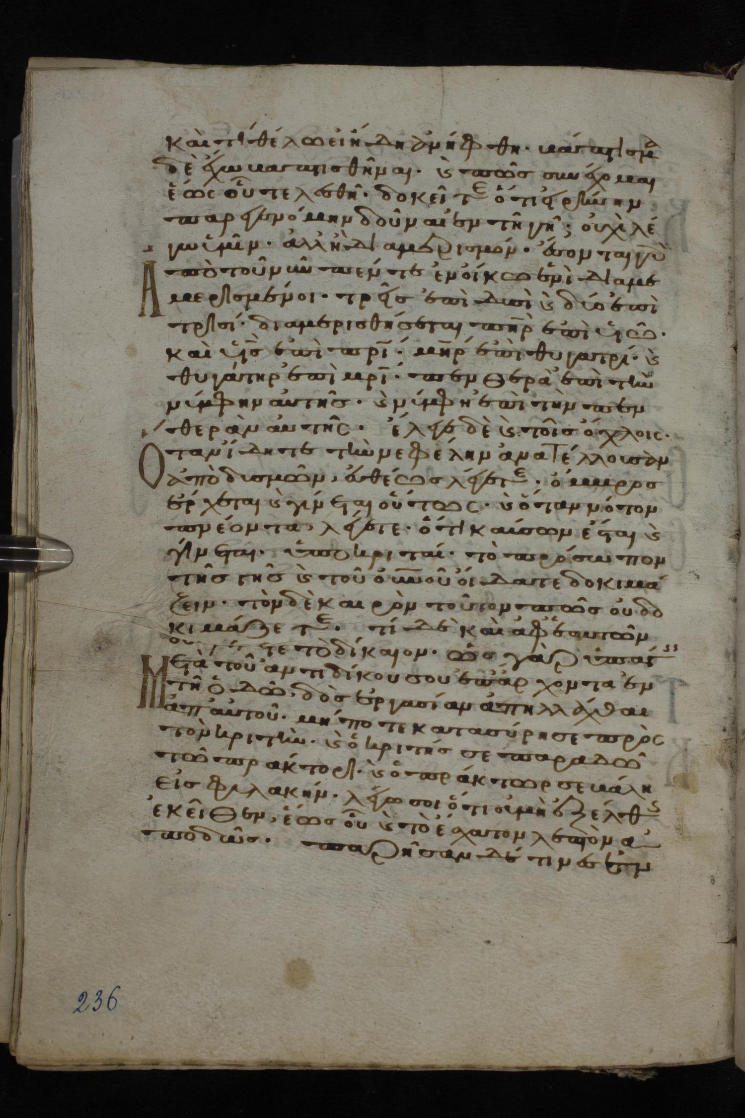 Twelfth century minuscule of the Gospels on parchment; 185 leaves, 1 column, 29 lines per column. Images were taken at the National Library of Greece in Athens.
