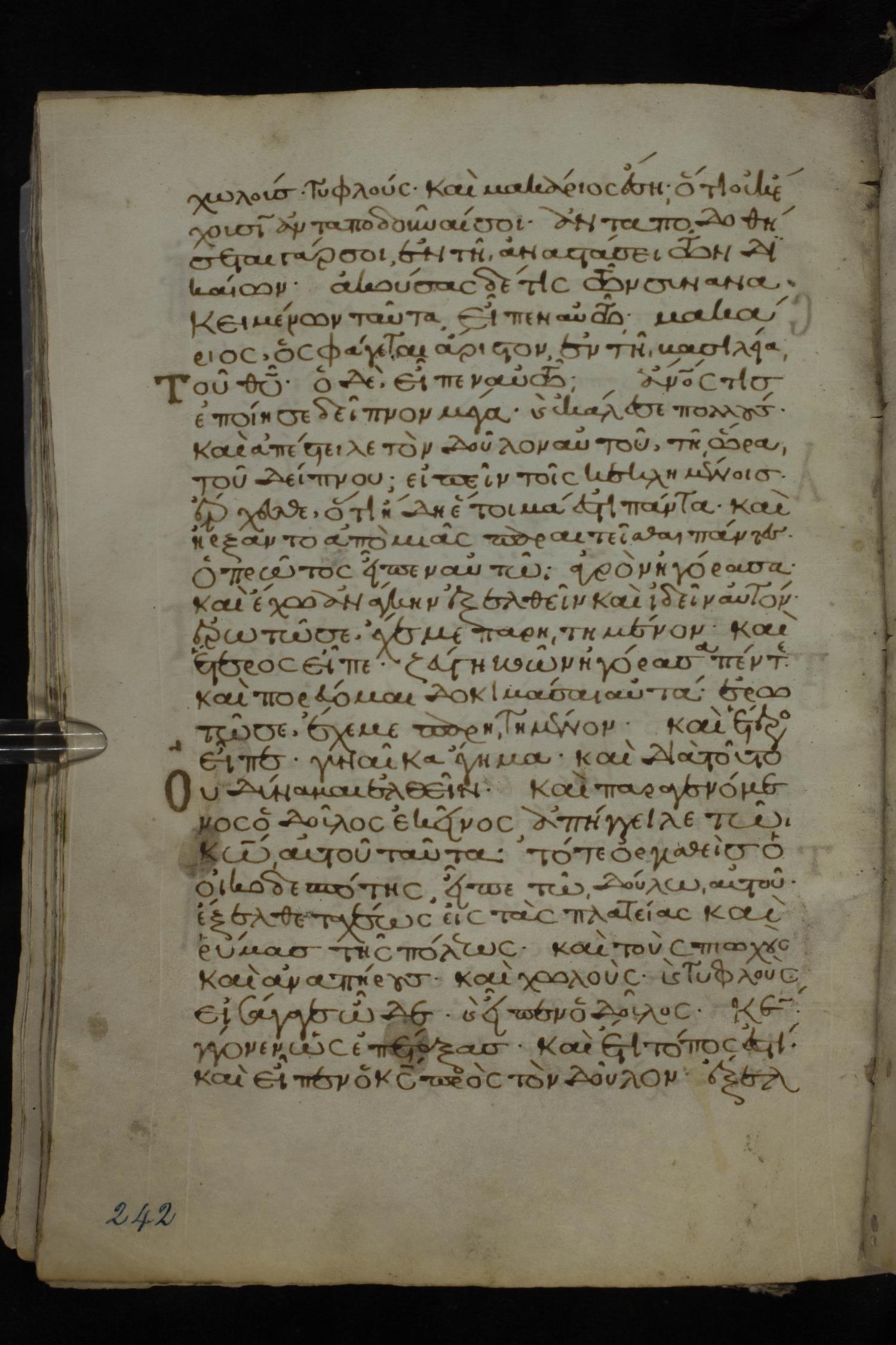Twelfth century minuscule of the Gospels on parchment; 185 leaves, 1 column, 29 lines per column. Images were taken at the National Library of Greece in Athens.