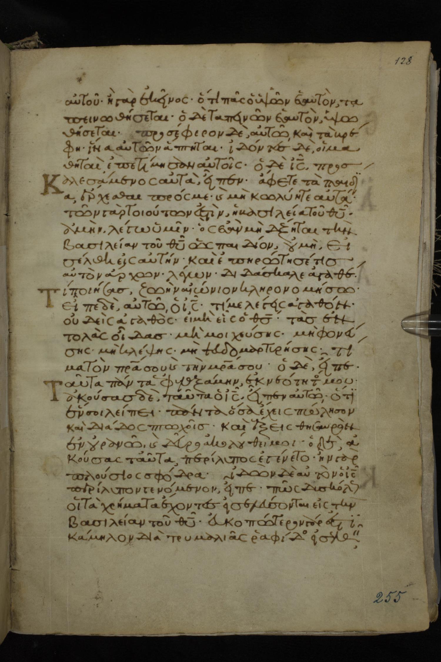 Twelfth century minuscule of the Gospels on parchment; 185 leaves, 1 column, 29 lines per column. Images were taken at the National Library of Greece in Athens.