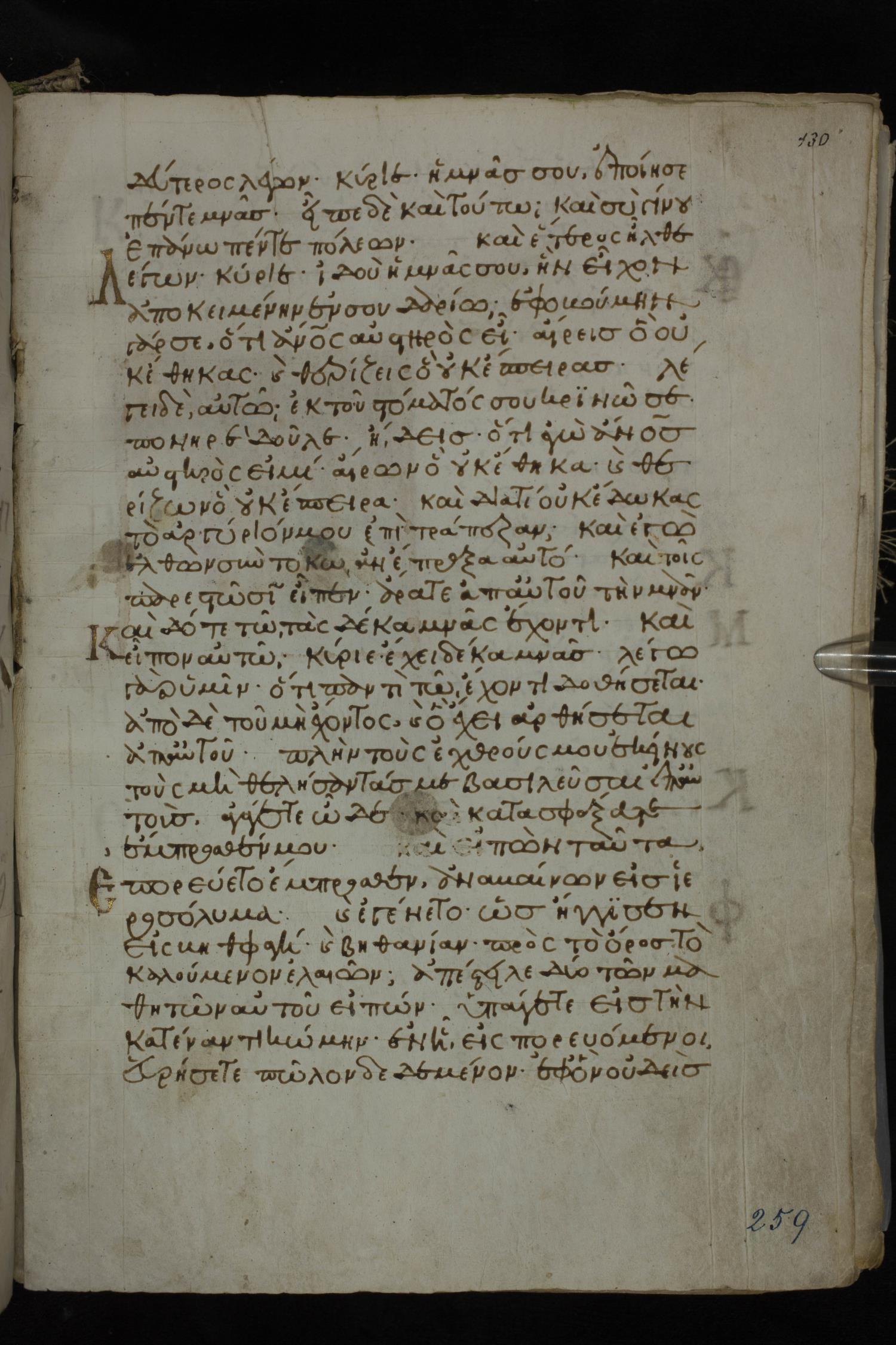 Twelfth century minuscule of the Gospels on parchment; 185 leaves, 1 column, 29 lines per column. Images were taken at the National Library of Greece in Athens.