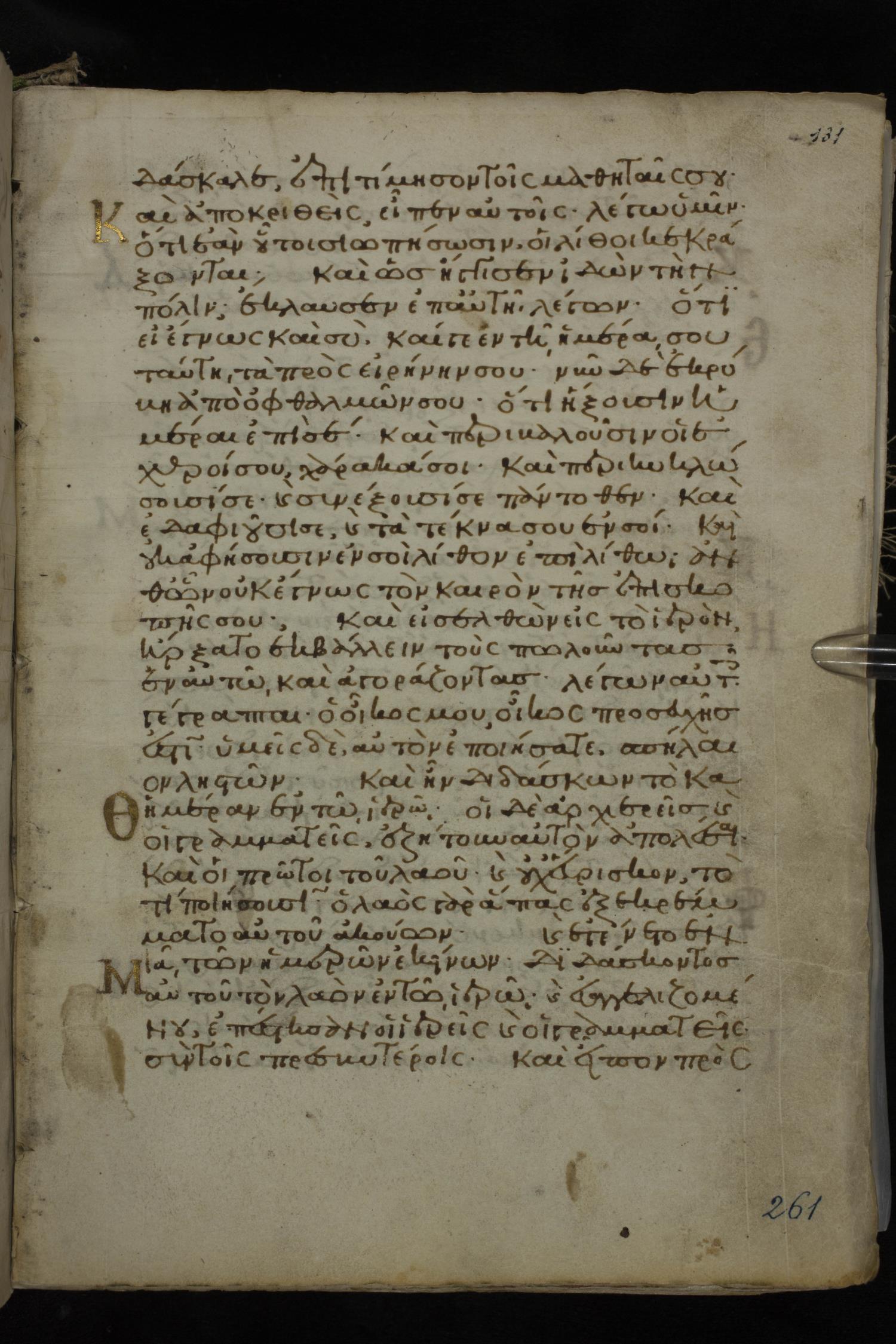 Twelfth century minuscule of the Gospels on parchment; 185 leaves, 1 column, 29 lines per column. Images were taken at the National Library of Greece in Athens.