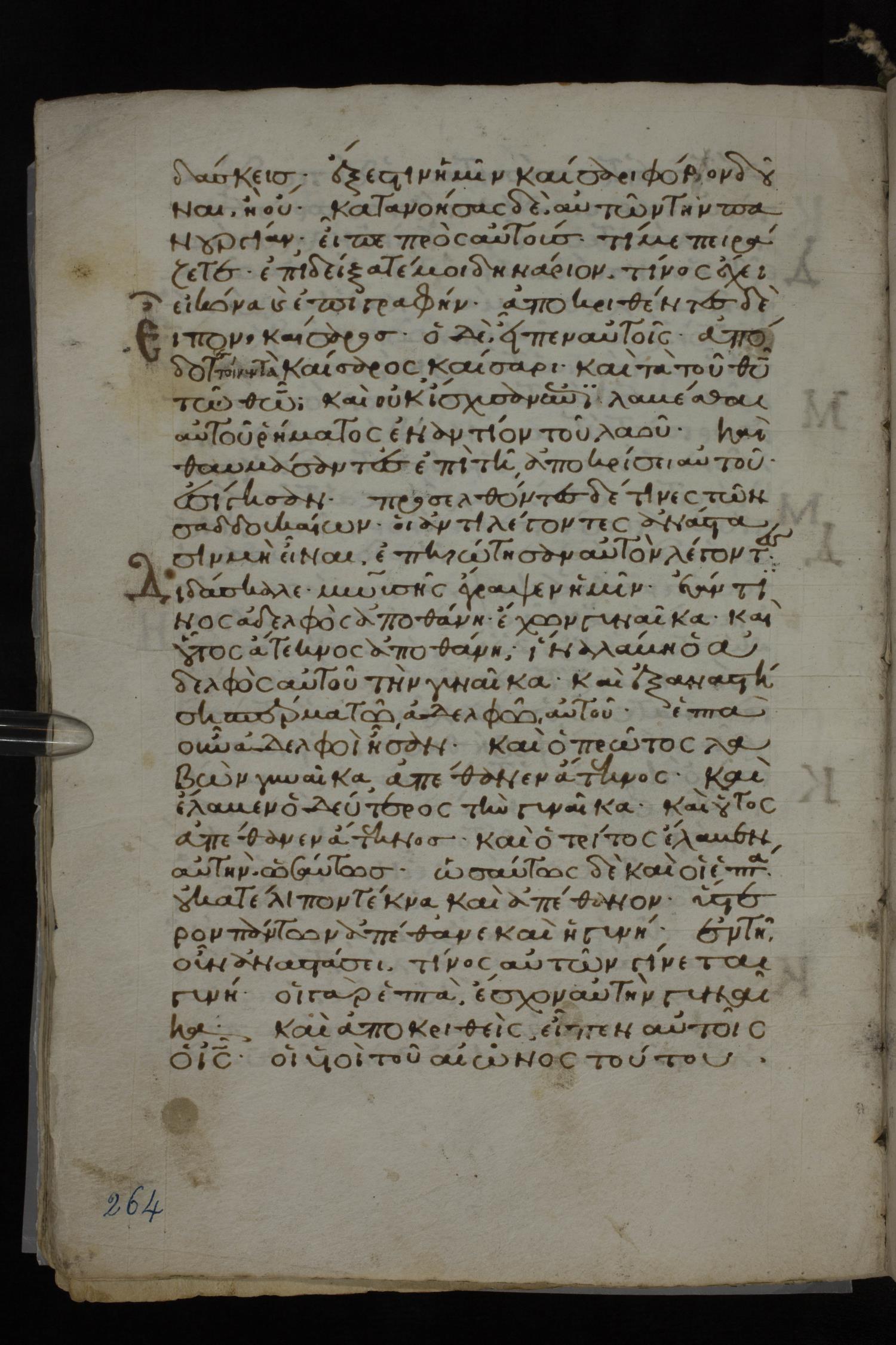 Twelfth century minuscule of the Gospels on parchment; 185 leaves, 1 column, 29 lines per column. Images were taken at the National Library of Greece in Athens.