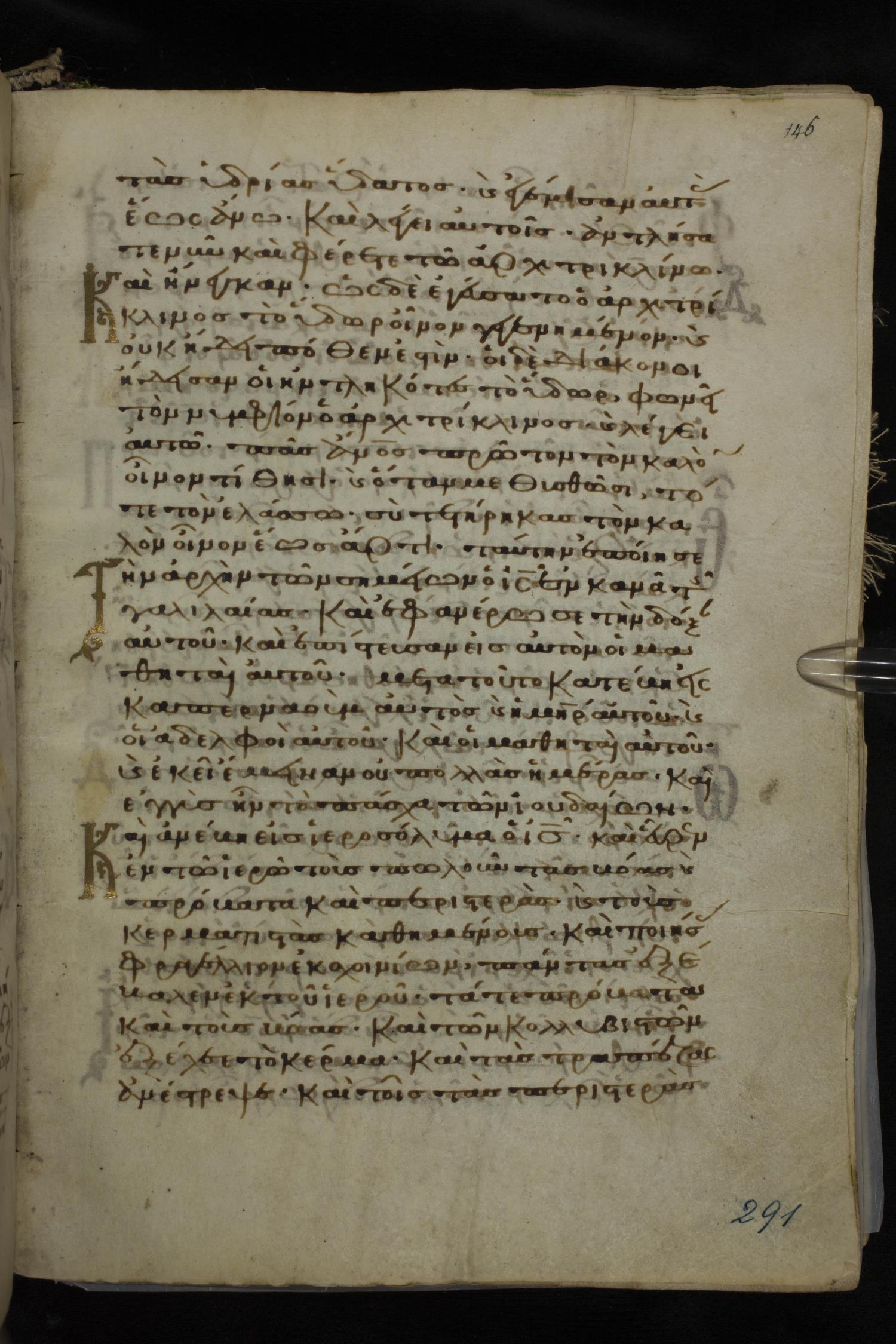 Twelfth century minuscule of the Gospels on parchment; 185 leaves, 1 column, 29 lines per column. Images were taken at the National Library of Greece in Athens.