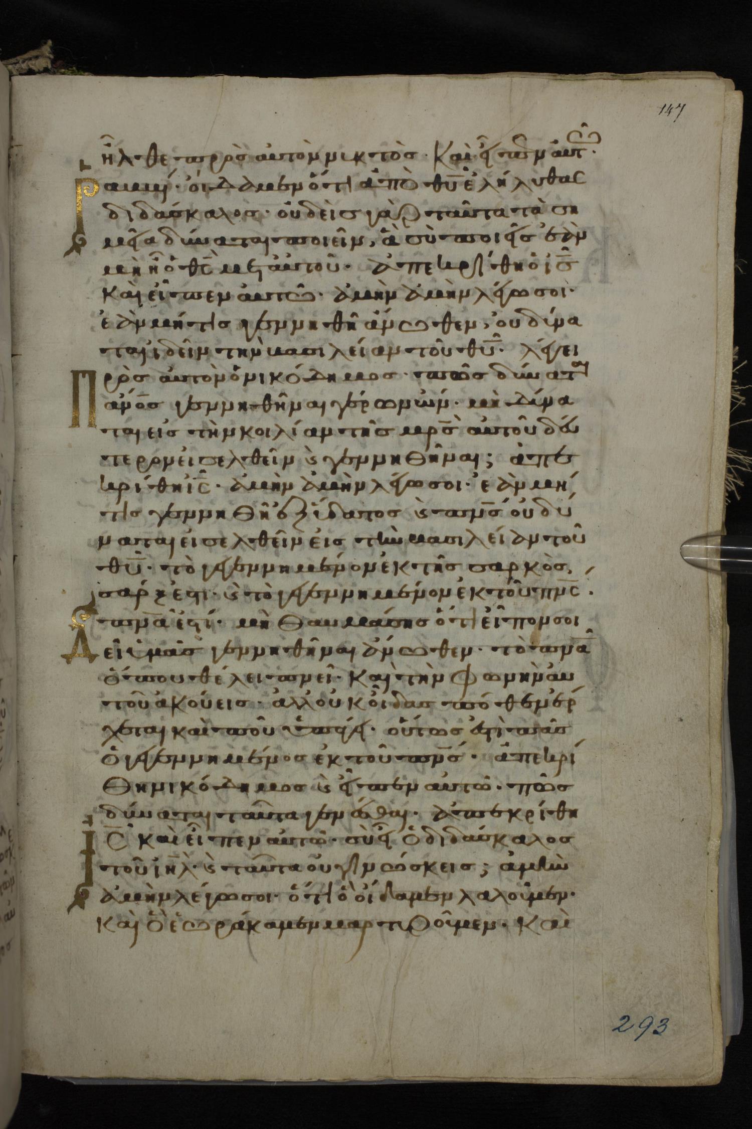 Twelfth century minuscule of the Gospels on parchment; 185 leaves, 1 column, 29 lines per column. Images were taken at the National Library of Greece in Athens.