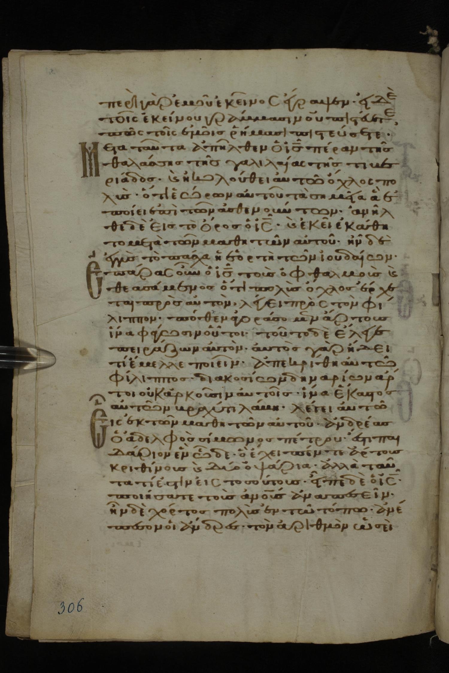 Twelfth century minuscule of the Gospels on parchment; 185 leaves, 1 column, 29 lines per column. Images were taken at the National Library of Greece in Athens.