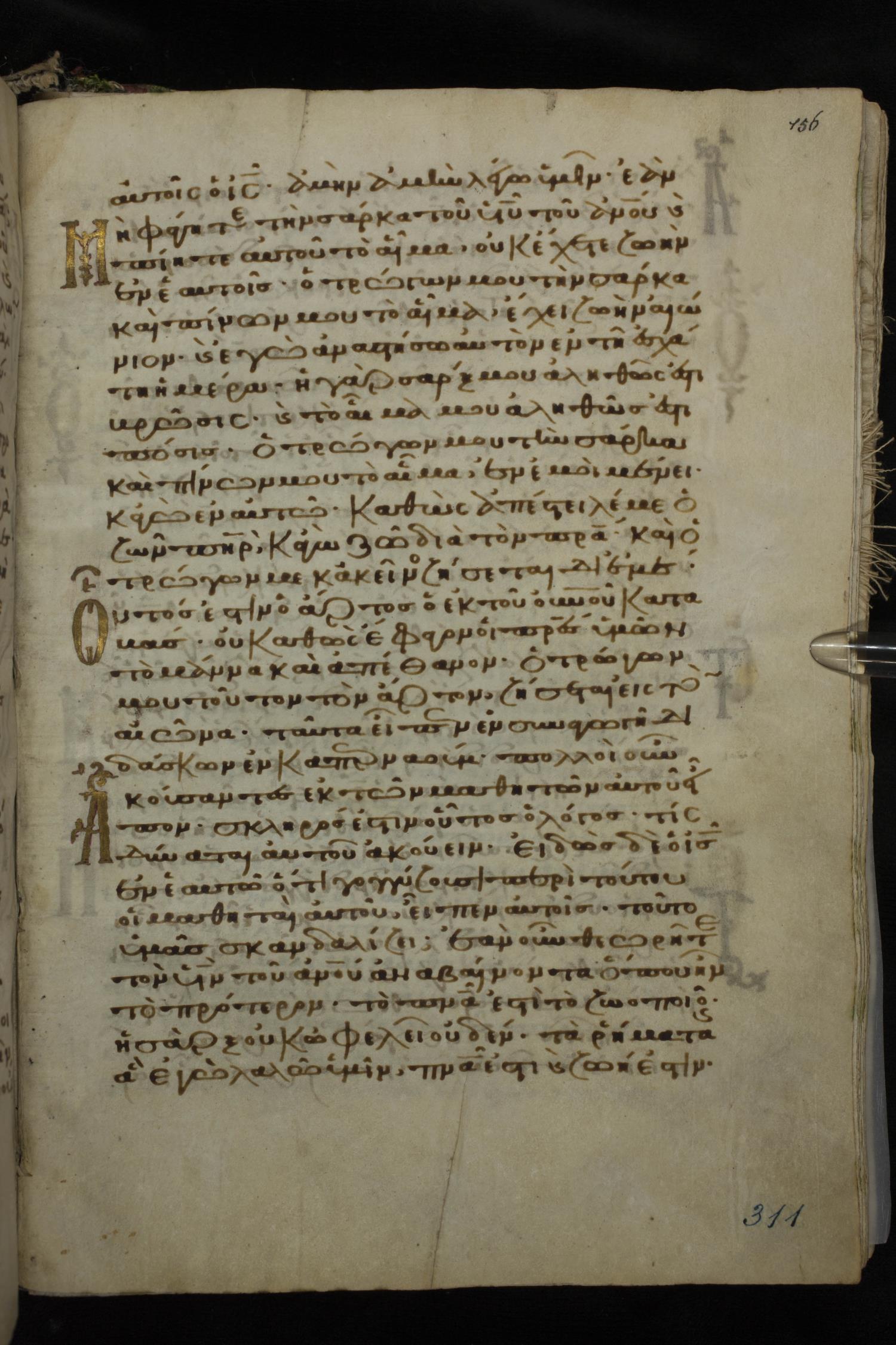 Twelfth century minuscule of the Gospels on parchment; 185 leaves, 1 column, 29 lines per column. Images were taken at the National Library of Greece in Athens.
