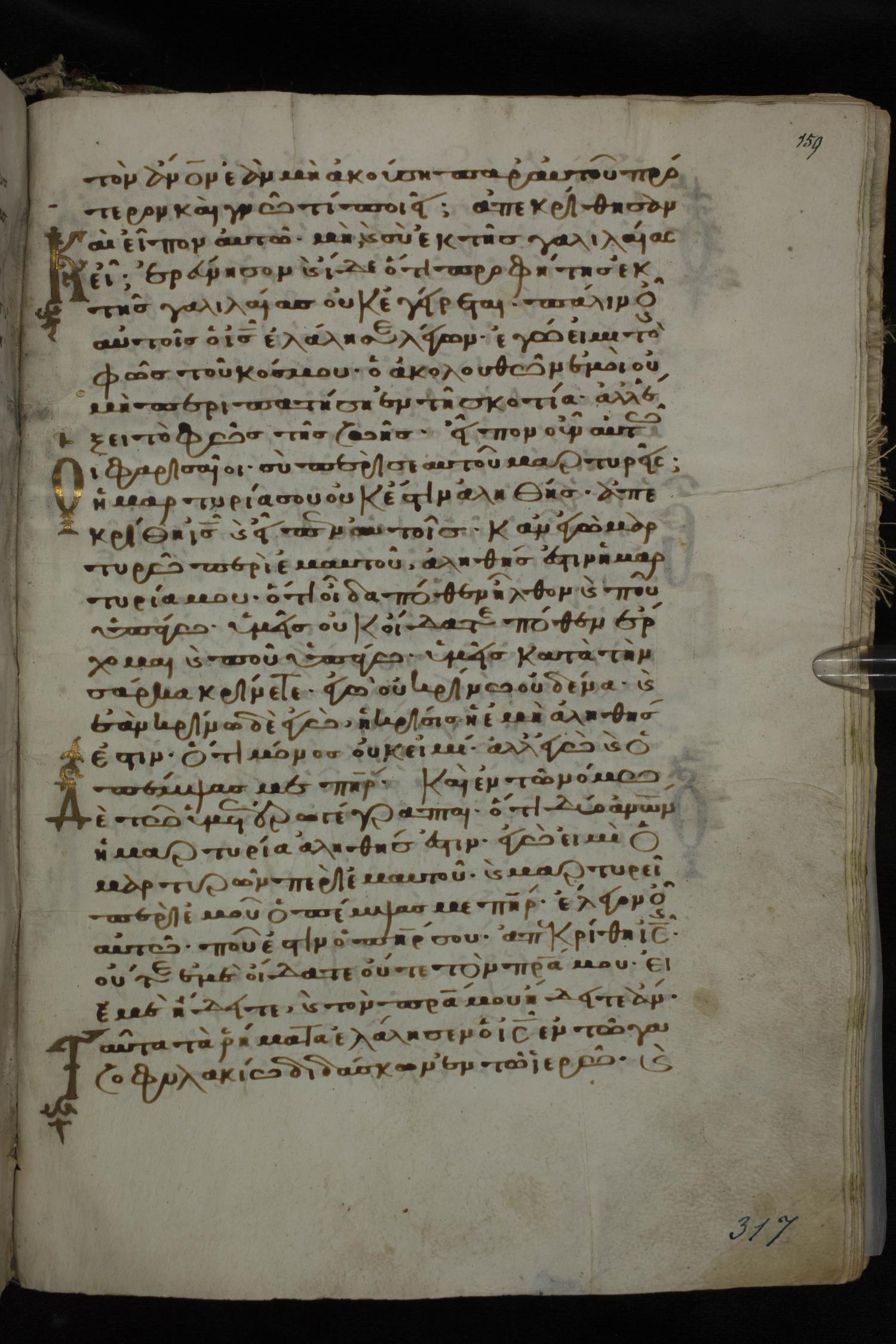 Twelfth century minuscule of the Gospels on parchment; 185 leaves, 1 column, 29 lines per column. Images were taken at the National Library of Greece in Athens.