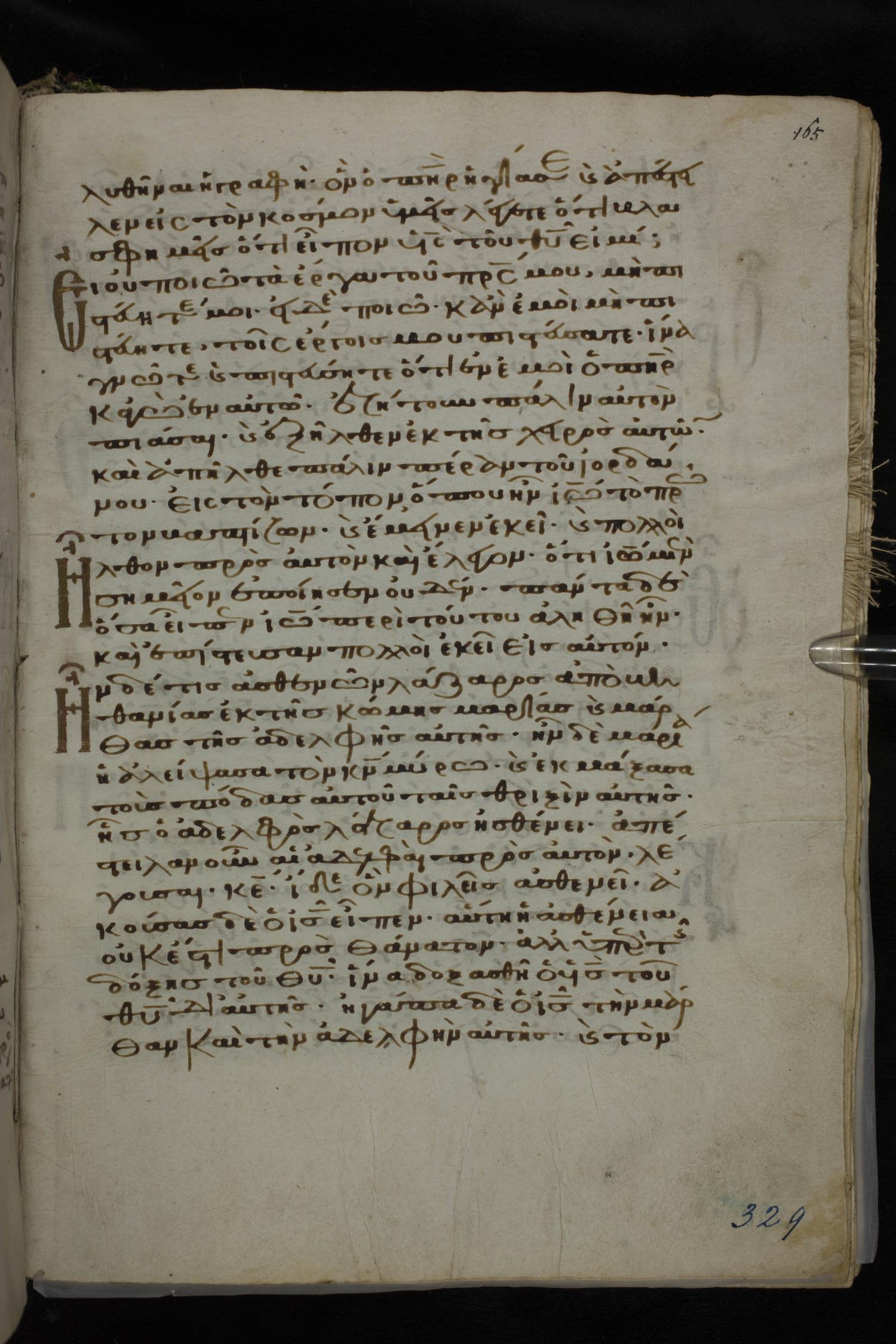 Twelfth century minuscule of the Gospels on parchment; 185 leaves, 1 column, 29 lines per column. Images were taken at the National Library of Greece in Athens.