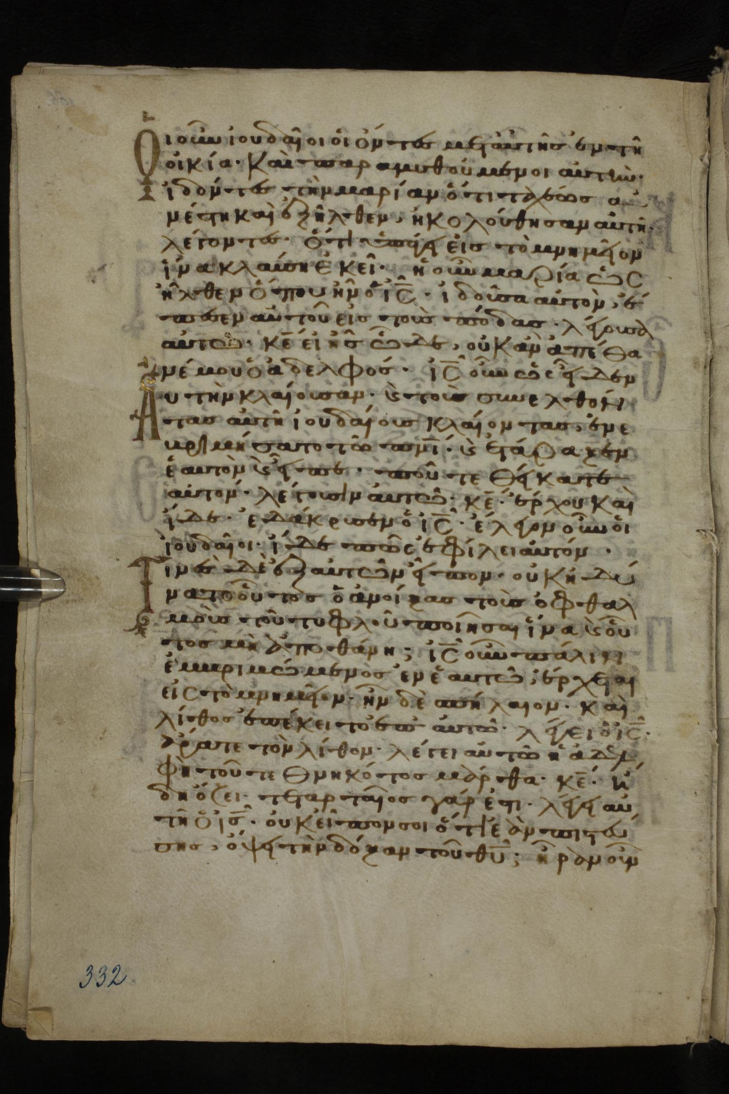 Twelfth century minuscule of the Gospels on parchment; 185 leaves, 1 column, 29 lines per column. Images were taken at the National Library of Greece in Athens.