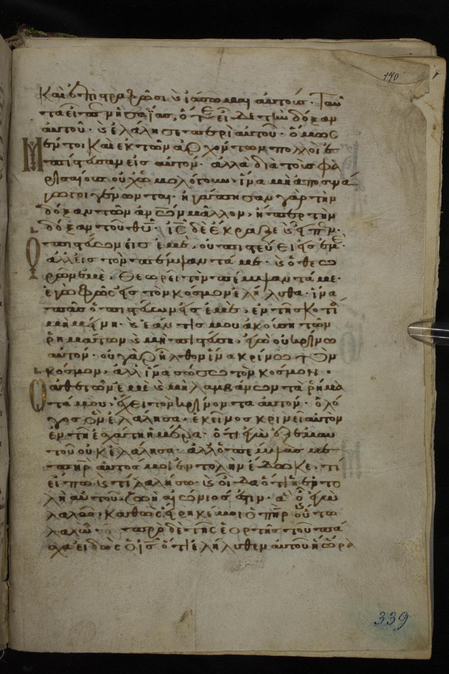 Twelfth century minuscule of the Gospels on parchment; 185 leaves, 1 column, 29 lines per column. Images were taken at the National Library of Greece in Athens.