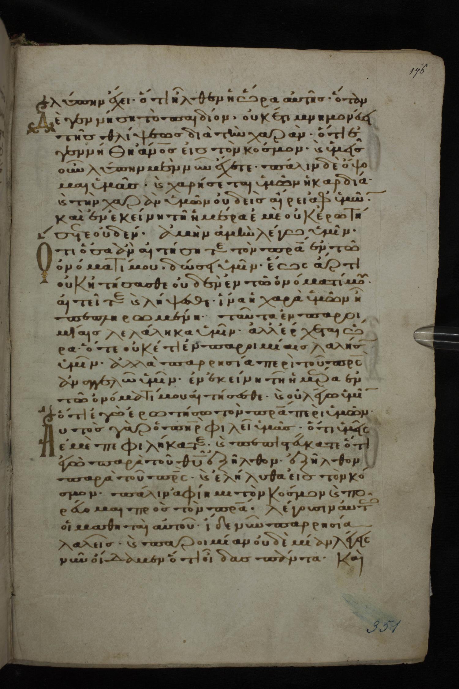 Twelfth century minuscule of the Gospels on parchment; 185 leaves, 1 column, 29 lines per column. Images were taken at the National Library of Greece in Athens.