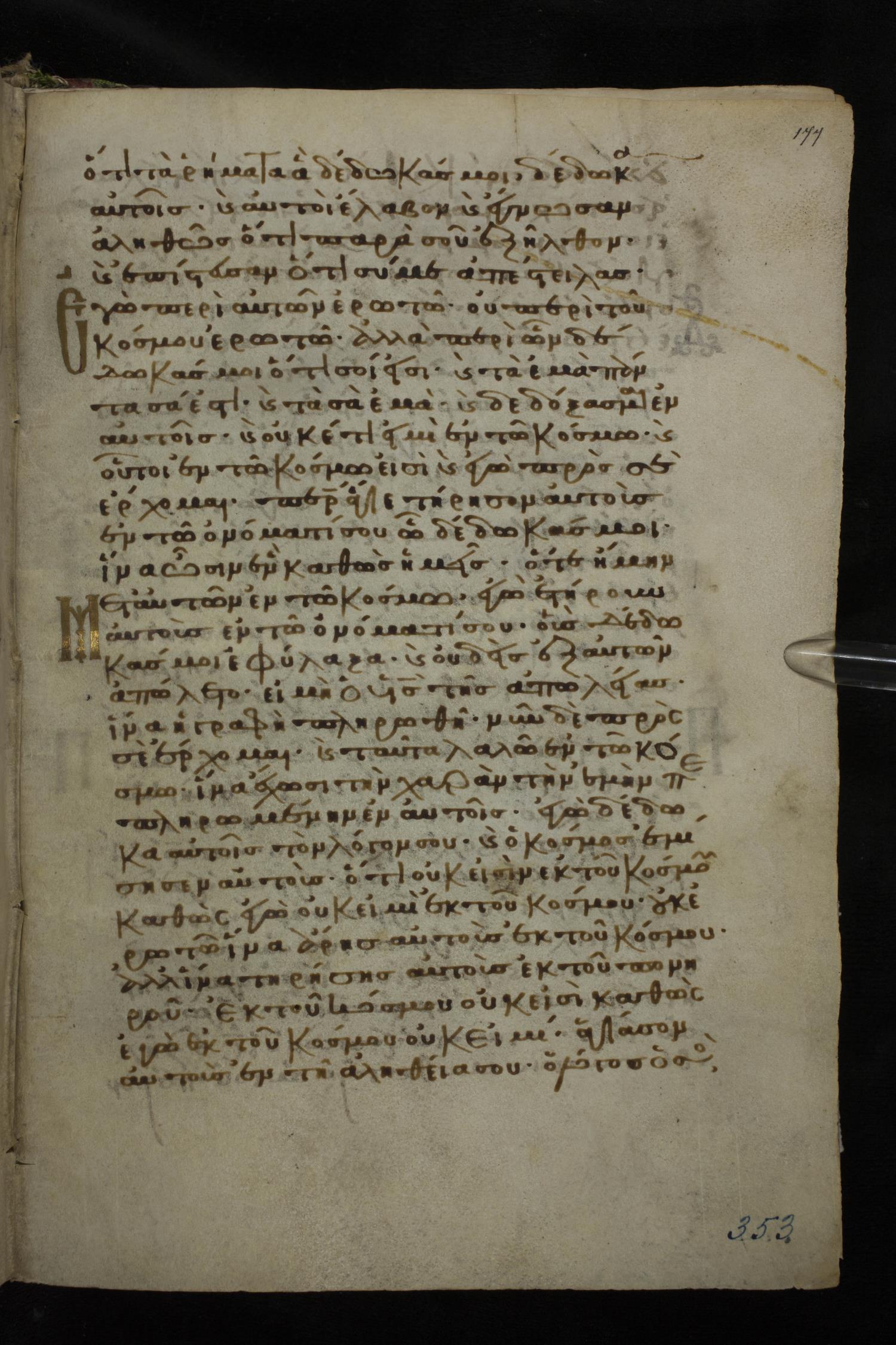 Twelfth century minuscule of the Gospels on parchment; 185 leaves, 1 column, 29 lines per column. Images were taken at the National Library of Greece in Athens.