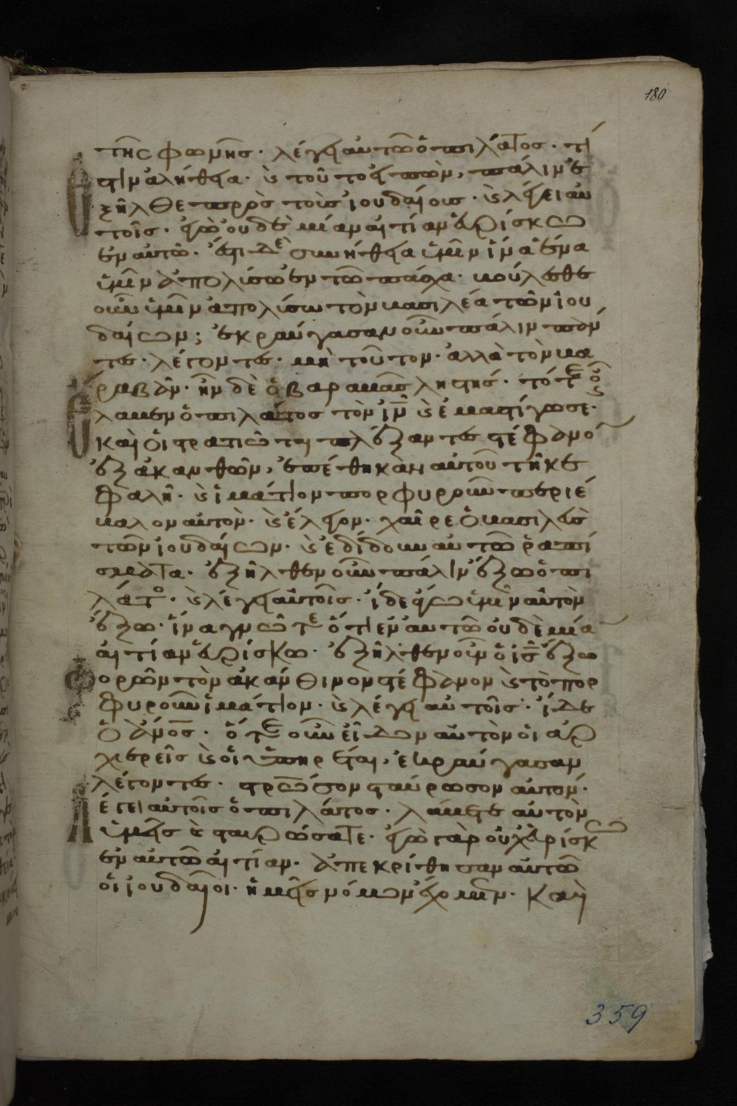 Twelfth century minuscule of the Gospels on parchment; 185 leaves, 1 column, 29 lines per column. Images were taken at the National Library of Greece in Athens.