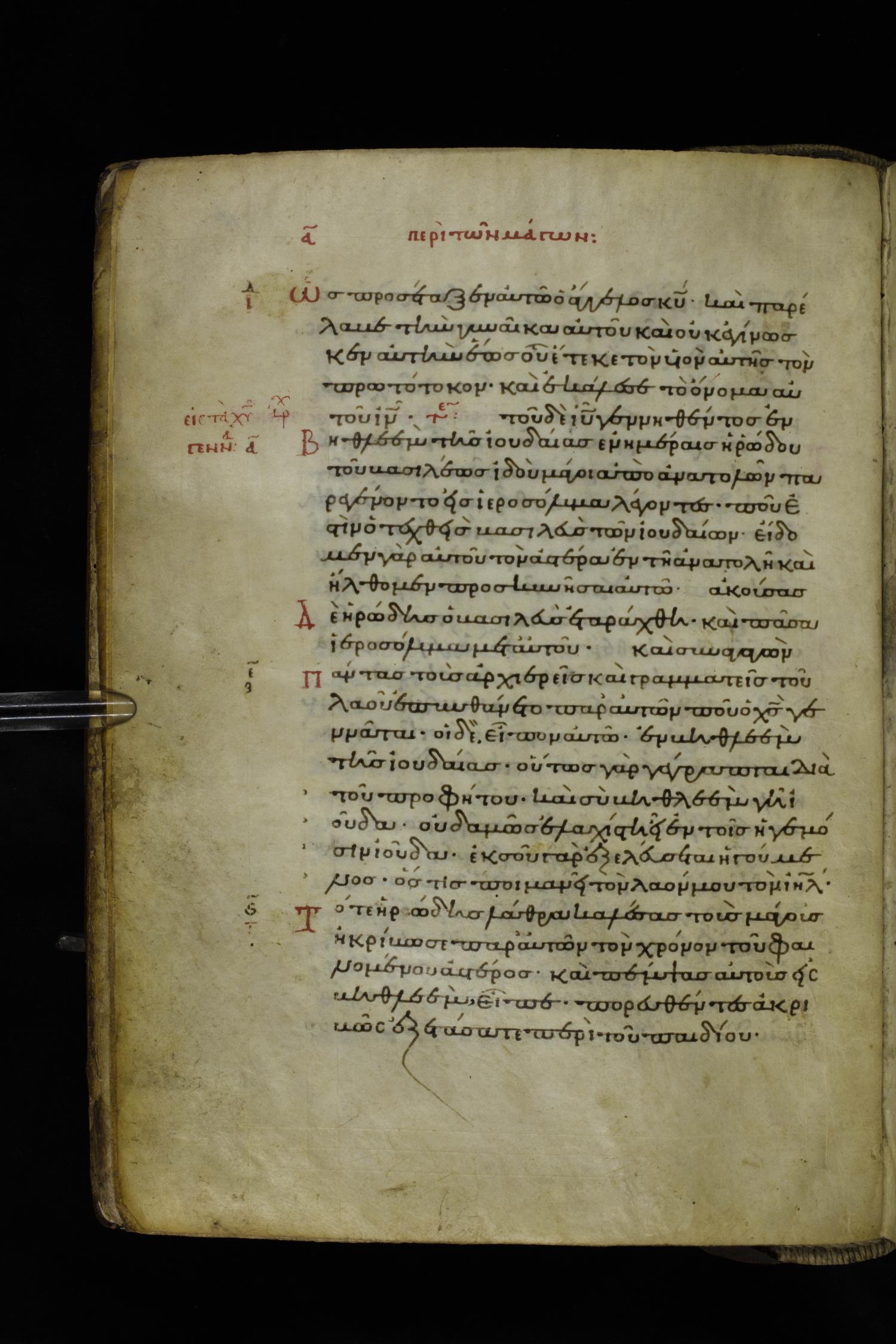 Twelfth century minuscule of the Gospels on parchment; 195 leaves, 1 column, 25 lines per column. Images were taken at the National Library of Greece in Athens.