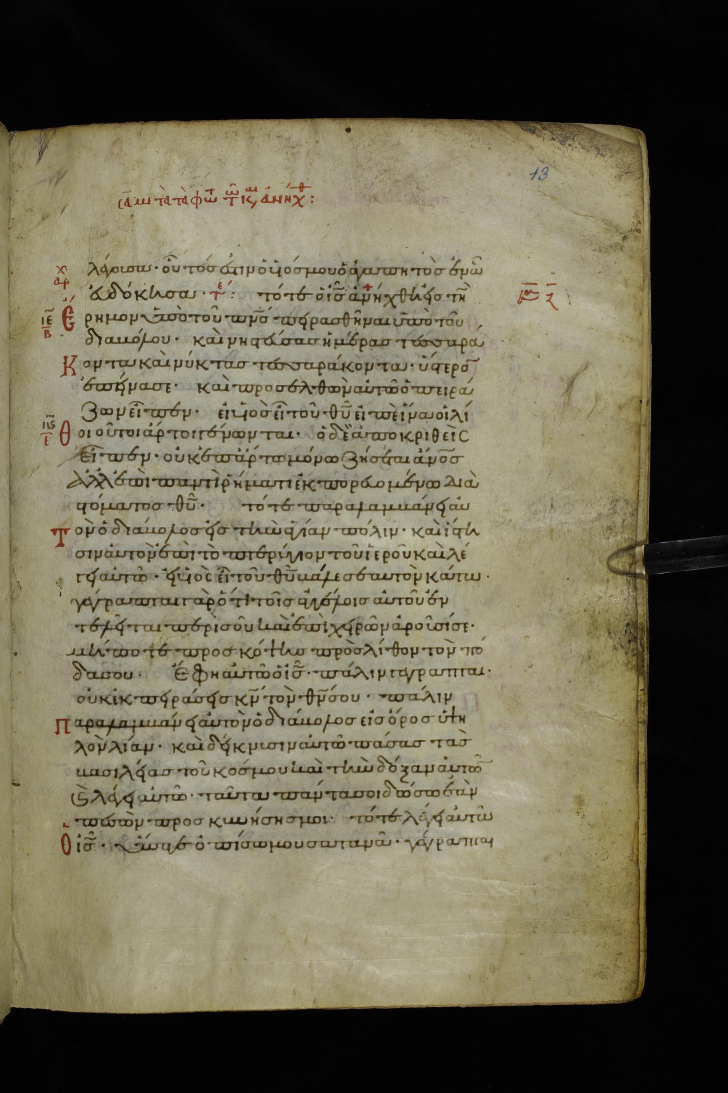 Twelfth century minuscule of the Gospels on parchment; 195 leaves, 1 column, 25 lines per column. Images were taken at the National Library of Greece in Athens.