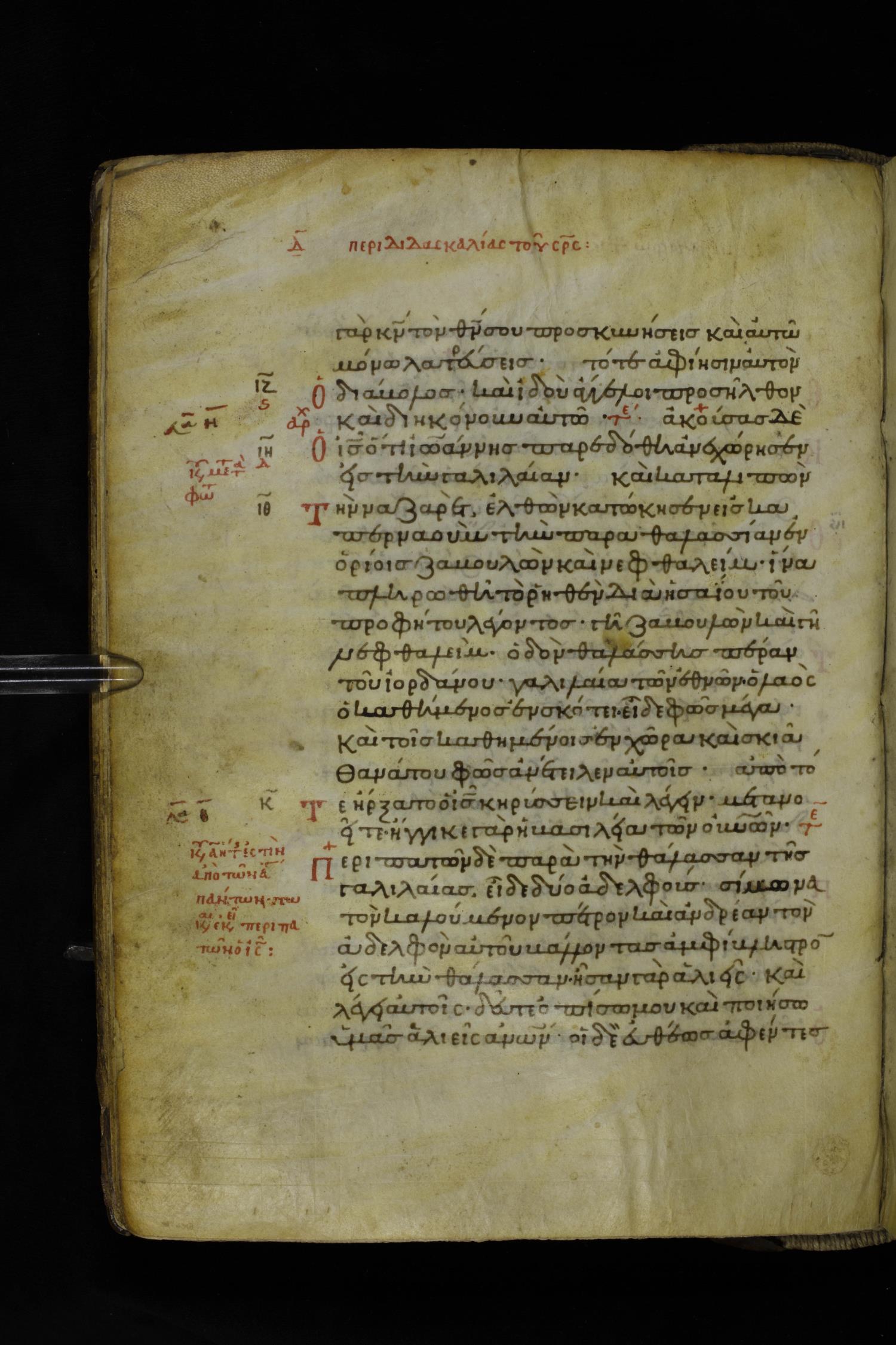Twelfth century minuscule of the Gospels on parchment; 195 leaves, 1 column, 25 lines per column. Images were taken at the National Library of Greece in Athens.