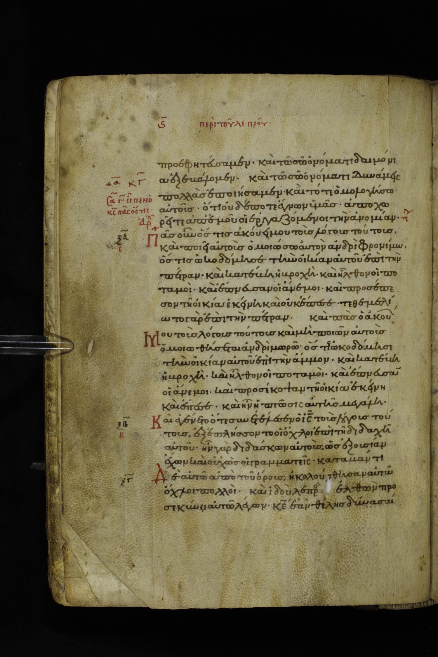 Twelfth century minuscule of the Gospels on parchment; 195 leaves, 1 column, 25 lines per column. Images were taken at the National Library of Greece in Athens.