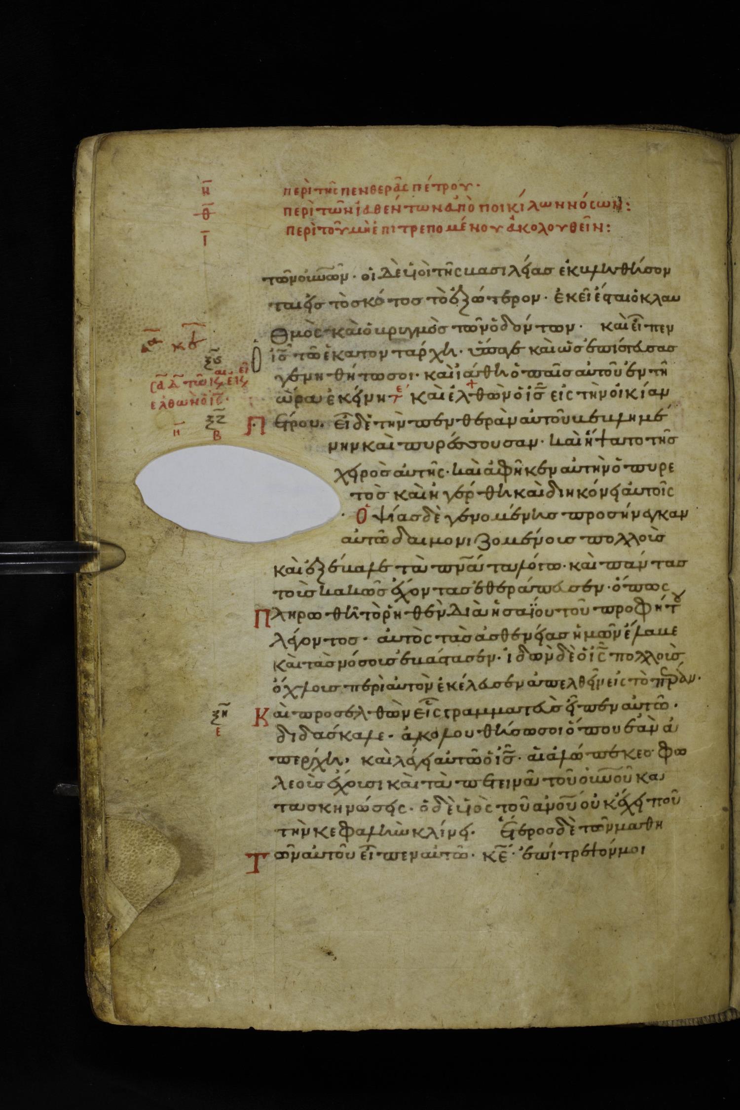 Twelfth century minuscule of the Gospels on parchment; 195 leaves, 1 column, 25 lines per column. Images were taken at the National Library of Greece in Athens.