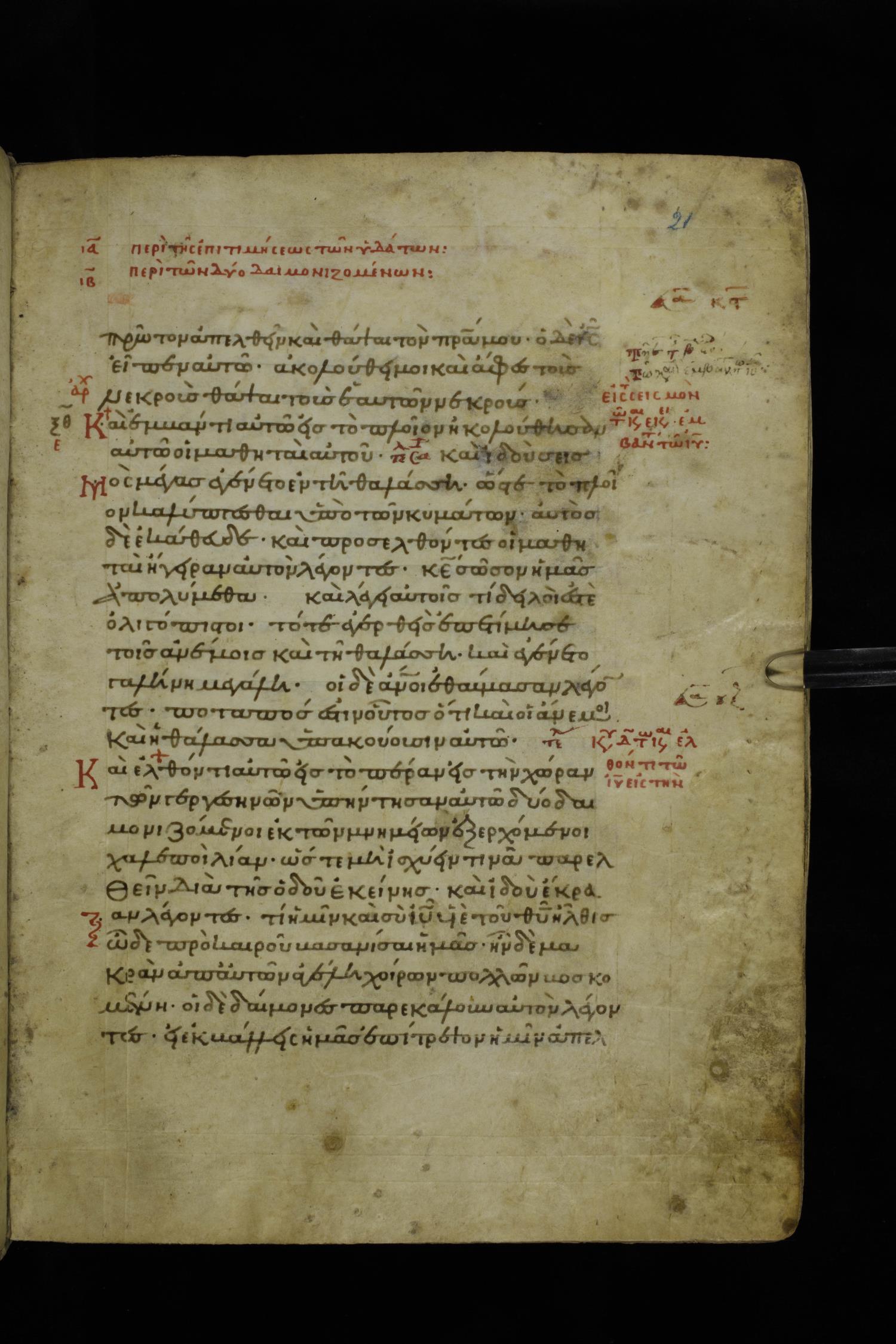 Twelfth century minuscule of the Gospels on parchment; 195 leaves, 1 column, 25 lines per column. Images were taken at the National Library of Greece in Athens.
