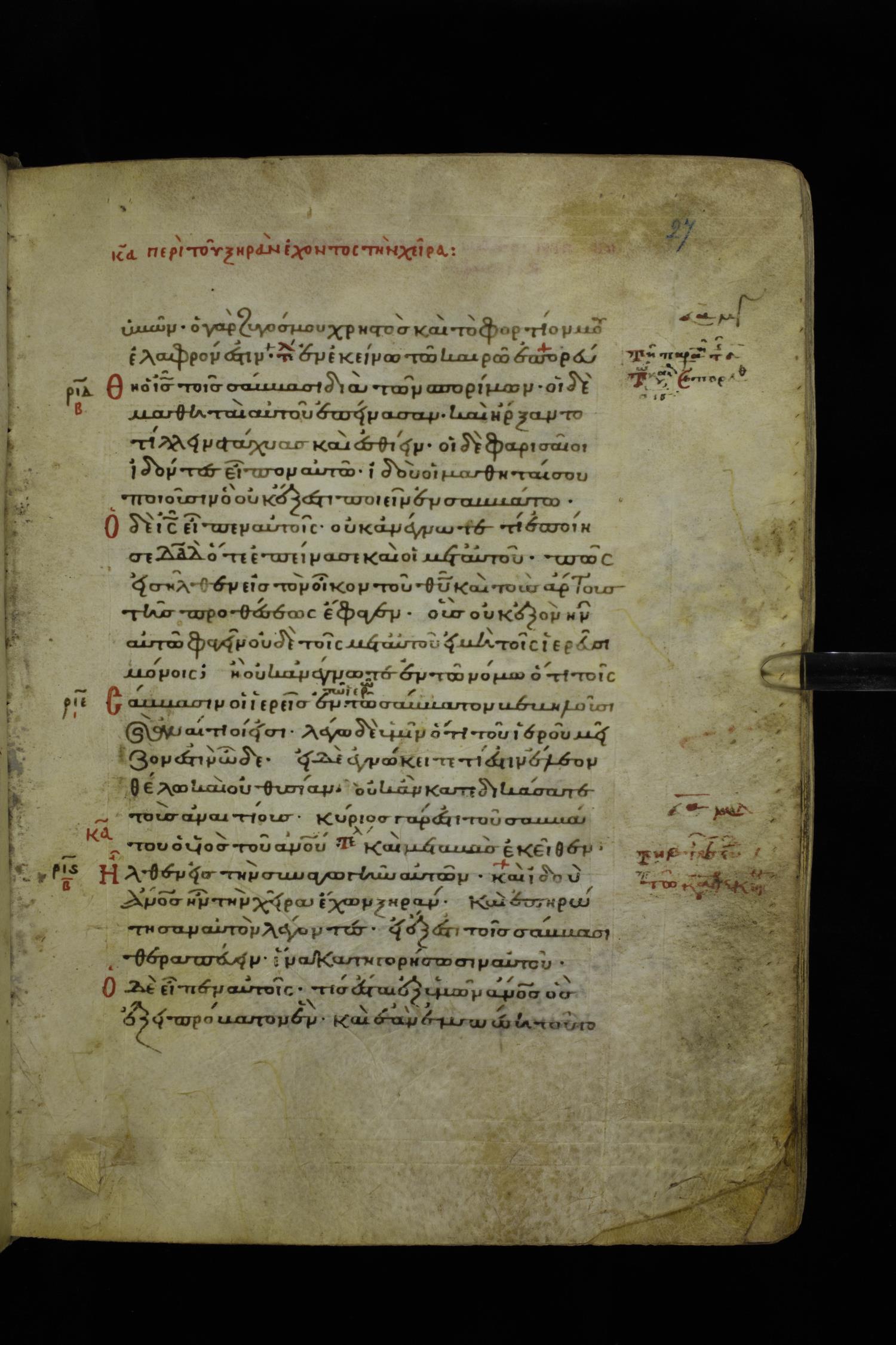 Twelfth century minuscule of the Gospels on parchment; 195 leaves, 1 column, 25 lines per column. Images were taken at the National Library of Greece in Athens.