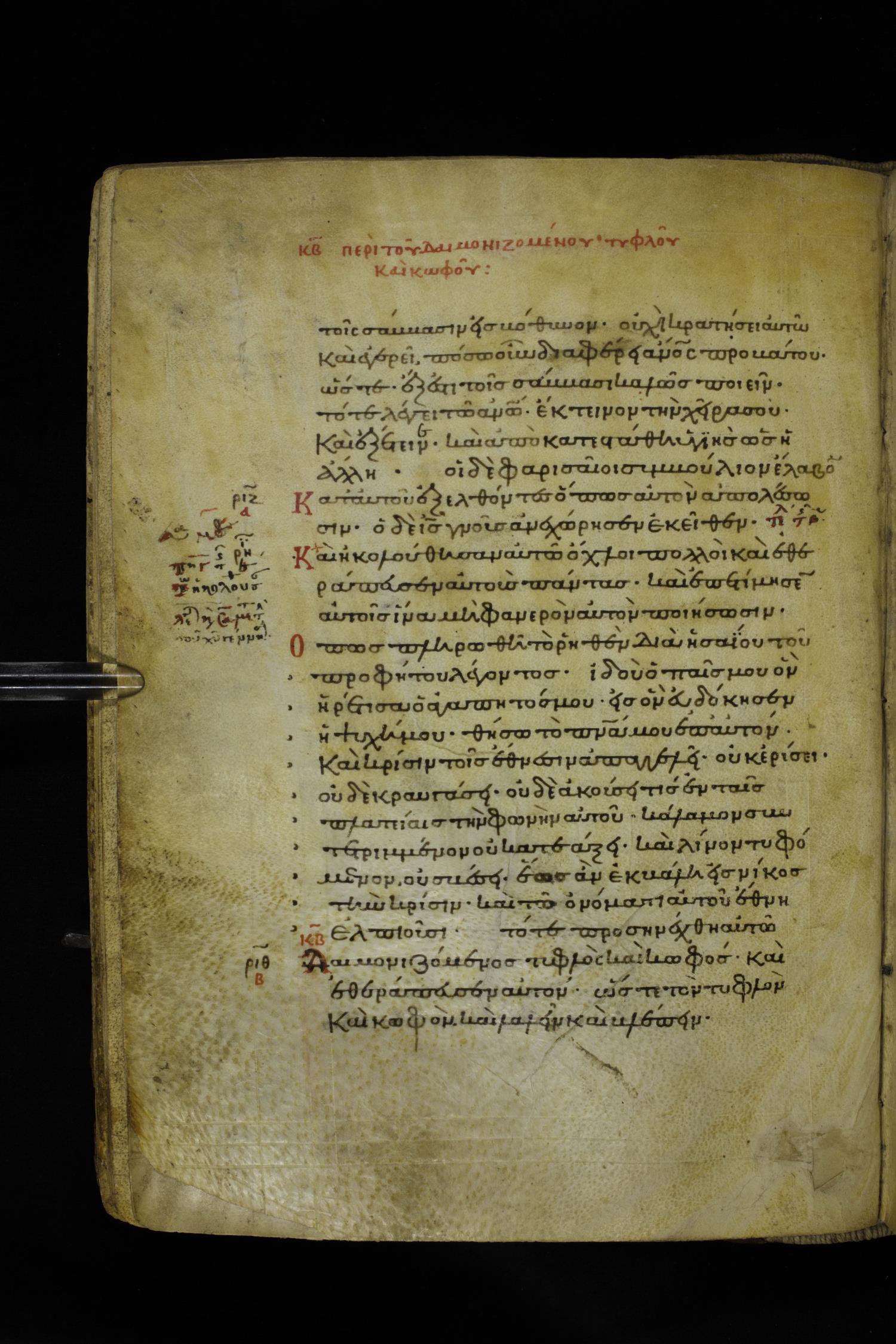 Twelfth century minuscule of the Gospels on parchment; 195 leaves, 1 column, 25 lines per column. Images were taken at the National Library of Greece in Athens.