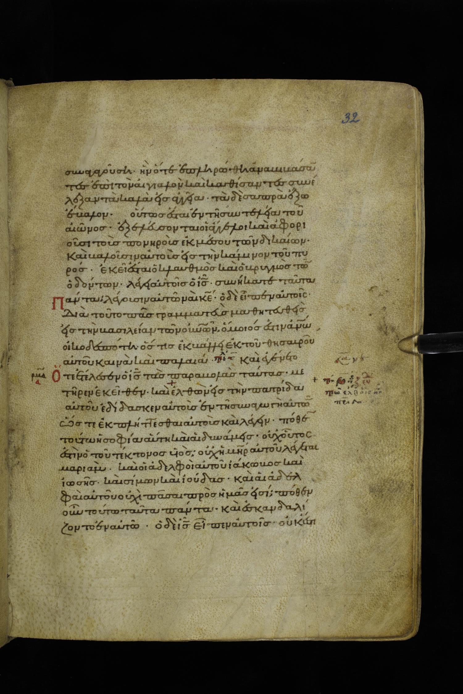 Twelfth century minuscule of the Gospels on parchment; 195 leaves, 1 column, 25 lines per column. Images were taken at the National Library of Greece in Athens.