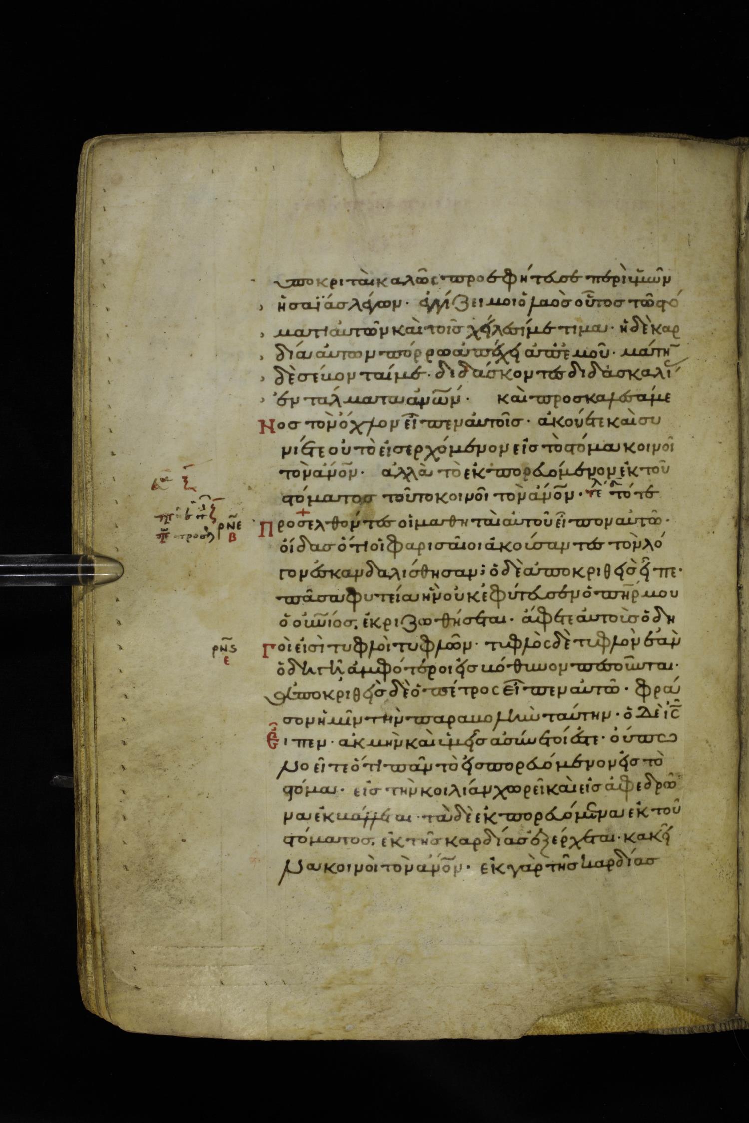 Twelfth century minuscule of the Gospels on parchment; 195 leaves, 1 column, 25 lines per column. Images were taken at the National Library of Greece in Athens.