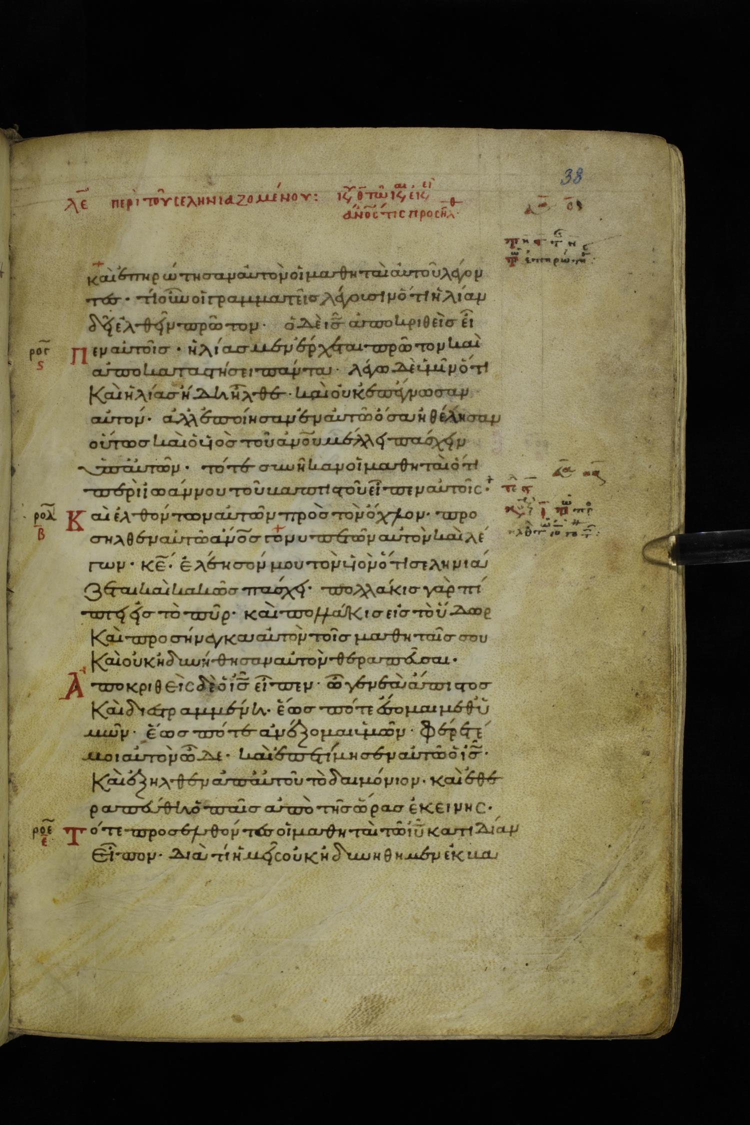 Twelfth century minuscule of the Gospels on parchment; 195 leaves, 1 column, 25 lines per column. Images were taken at the National Library of Greece in Athens.