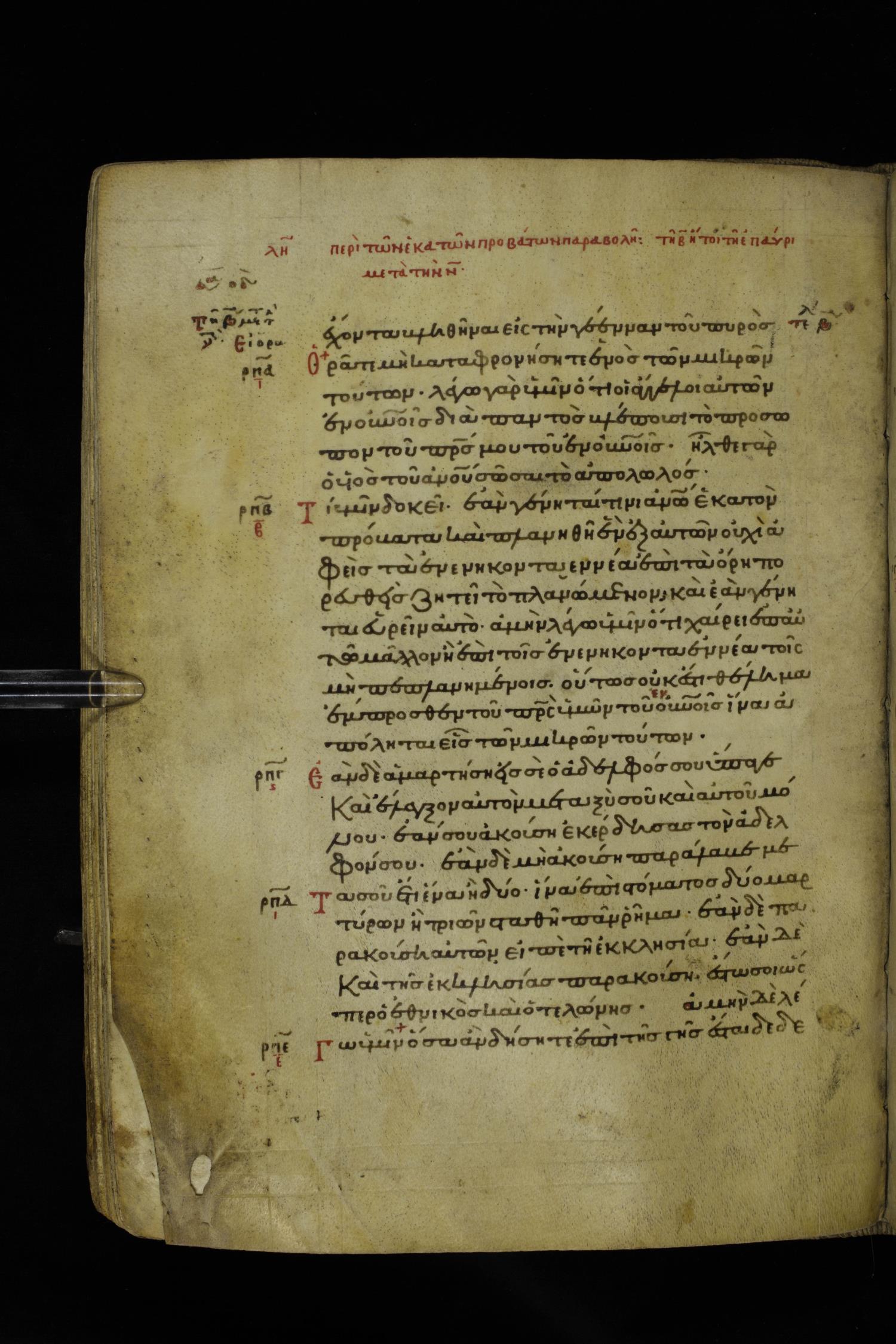 Twelfth century minuscule of the Gospels on parchment; 195 leaves, 1 column, 25 lines per column. Images were taken at the National Library of Greece in Athens.