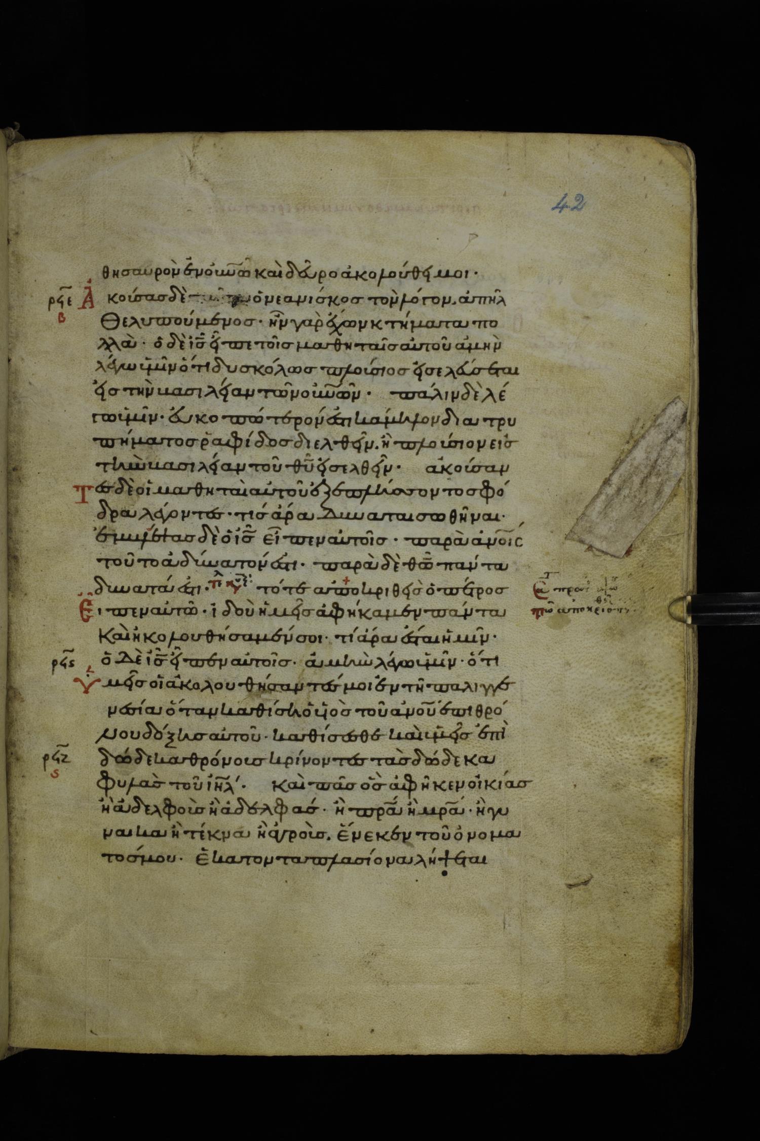 Twelfth century minuscule of the Gospels on parchment; 195 leaves, 1 column, 25 lines per column. Images were taken at the National Library of Greece in Athens.