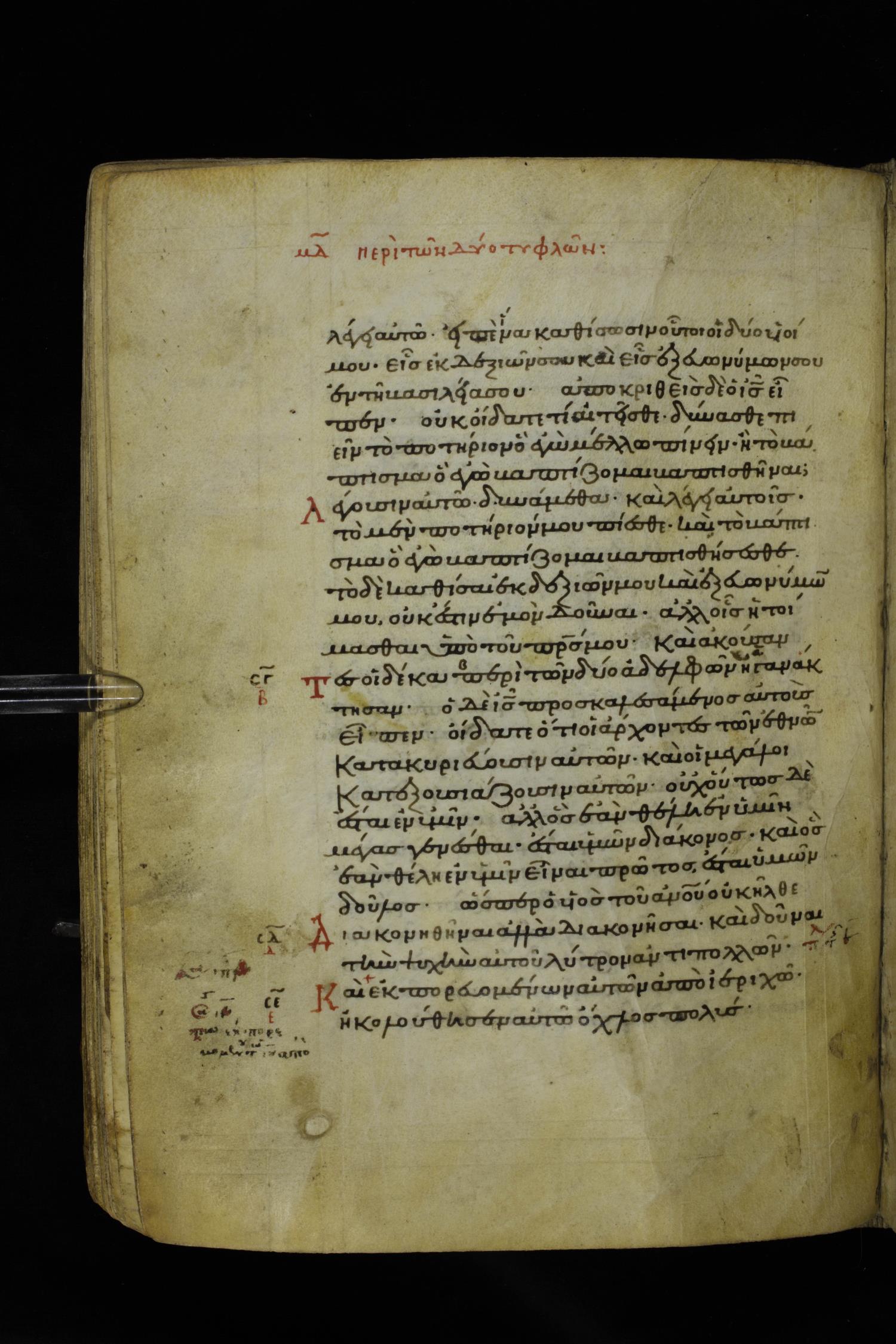 Twelfth century minuscule of the Gospels on parchment; 195 leaves, 1 column, 25 lines per column. Images were taken at the National Library of Greece in Athens.