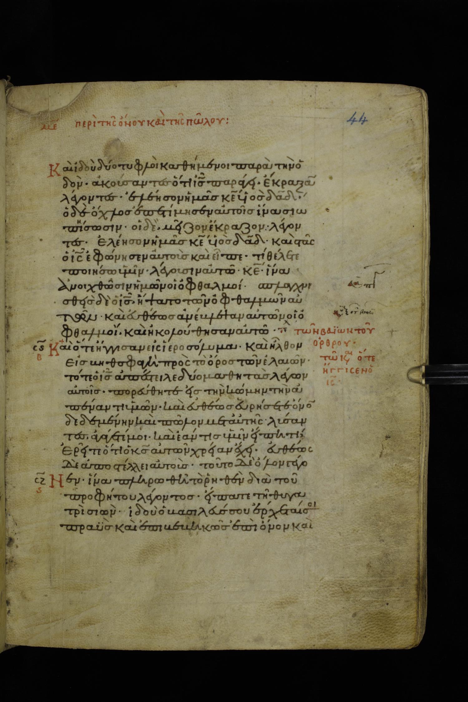 Twelfth century minuscule of the Gospels on parchment; 195 leaves, 1 column, 25 lines per column. Images were taken at the National Library of Greece in Athens.