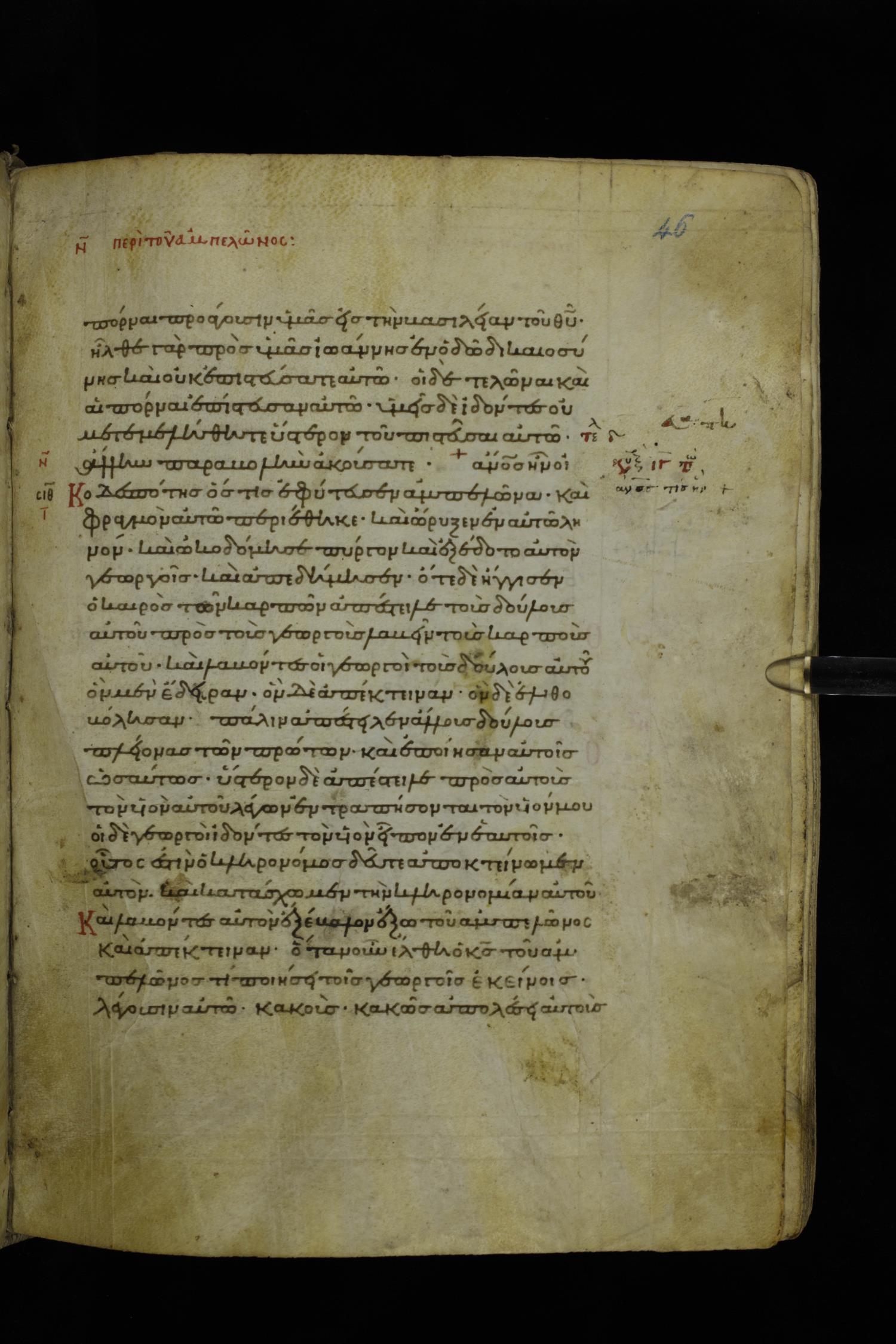 Twelfth century minuscule of the Gospels on parchment; 195 leaves, 1 column, 25 lines per column. Images were taken at the National Library of Greece in Athens.