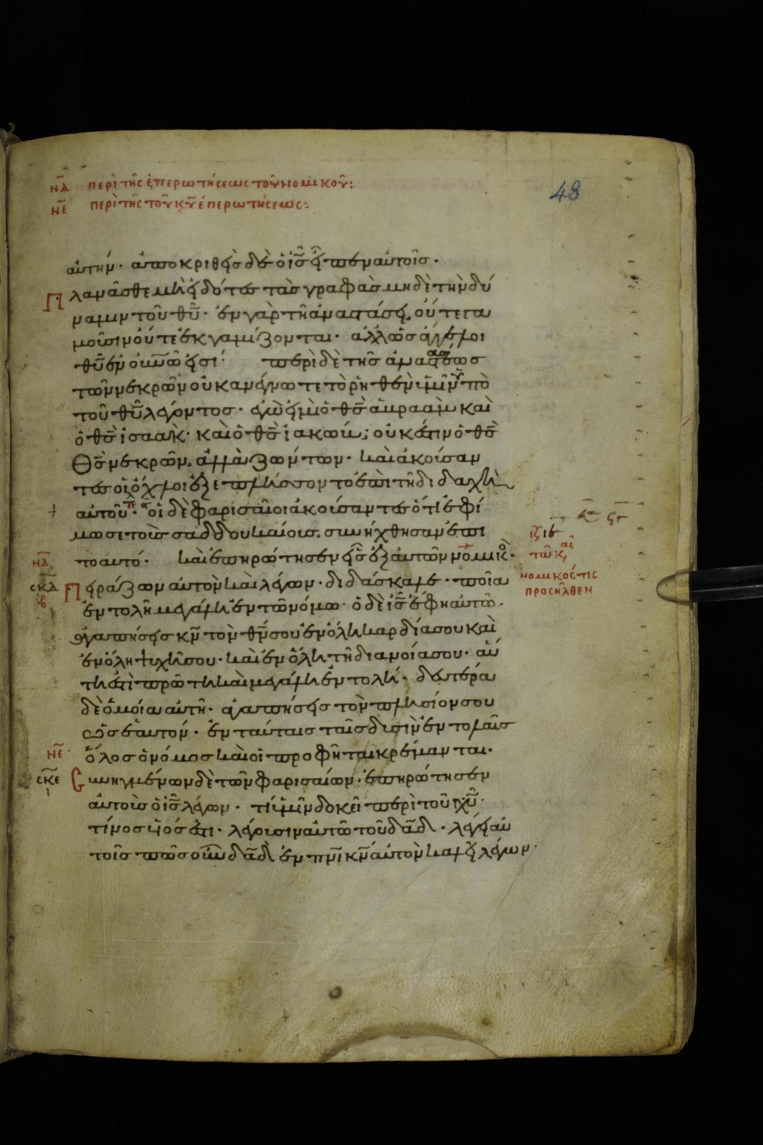 Twelfth century minuscule of the Gospels on parchment; 195 leaves, 1 column, 25 lines per column. Images were taken at the National Library of Greece in Athens.