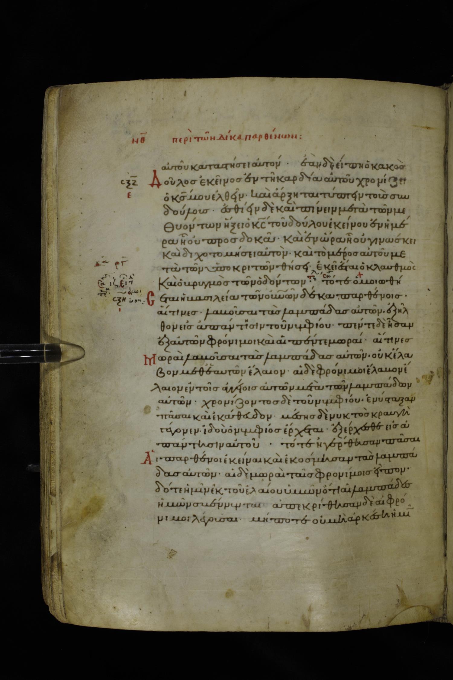 Twelfth century minuscule of the Gospels on parchment; 195 leaves, 1 column, 25 lines per column. Images were taken at the National Library of Greece in Athens.