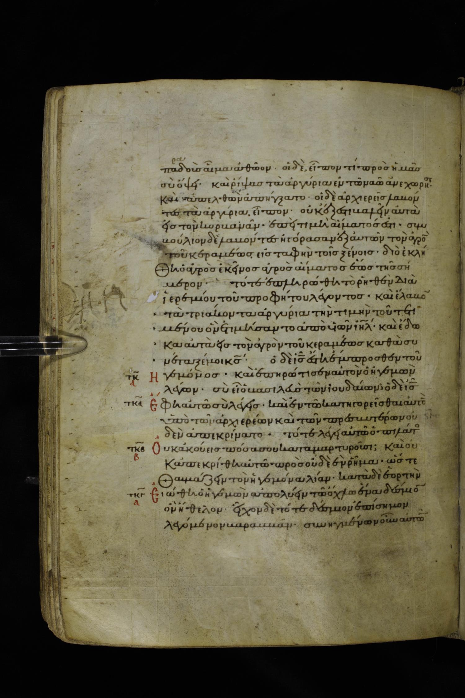 Twelfth century minuscule of the Gospels on parchment; 195 leaves, 1 column, 25 lines per column. Images were taken at the National Library of Greece in Athens.