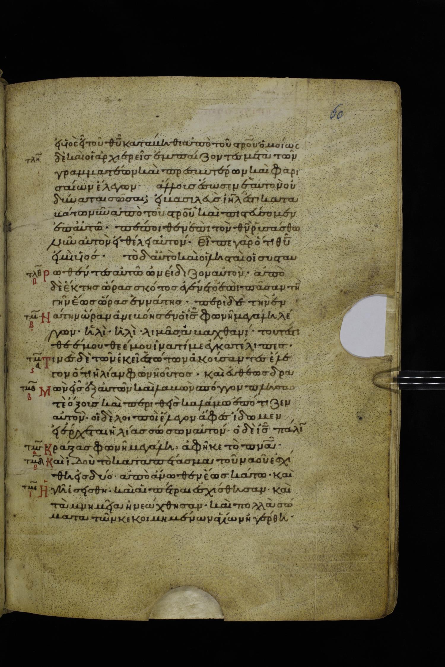 Twelfth century minuscule of the Gospels on parchment; 195 leaves, 1 column, 25 lines per column. Images were taken at the National Library of Greece in Athens.