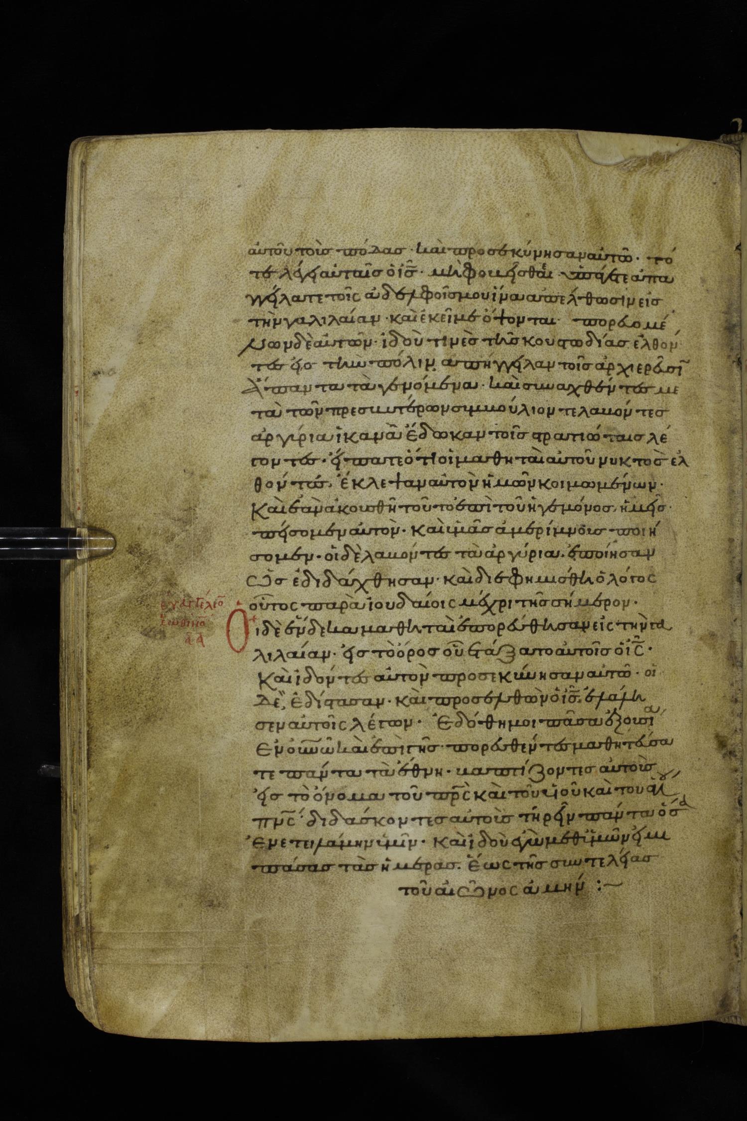 Twelfth century minuscule of the Gospels on parchment; 195 leaves, 1 column, 25 lines per column. Images were taken at the National Library of Greece in Athens.
