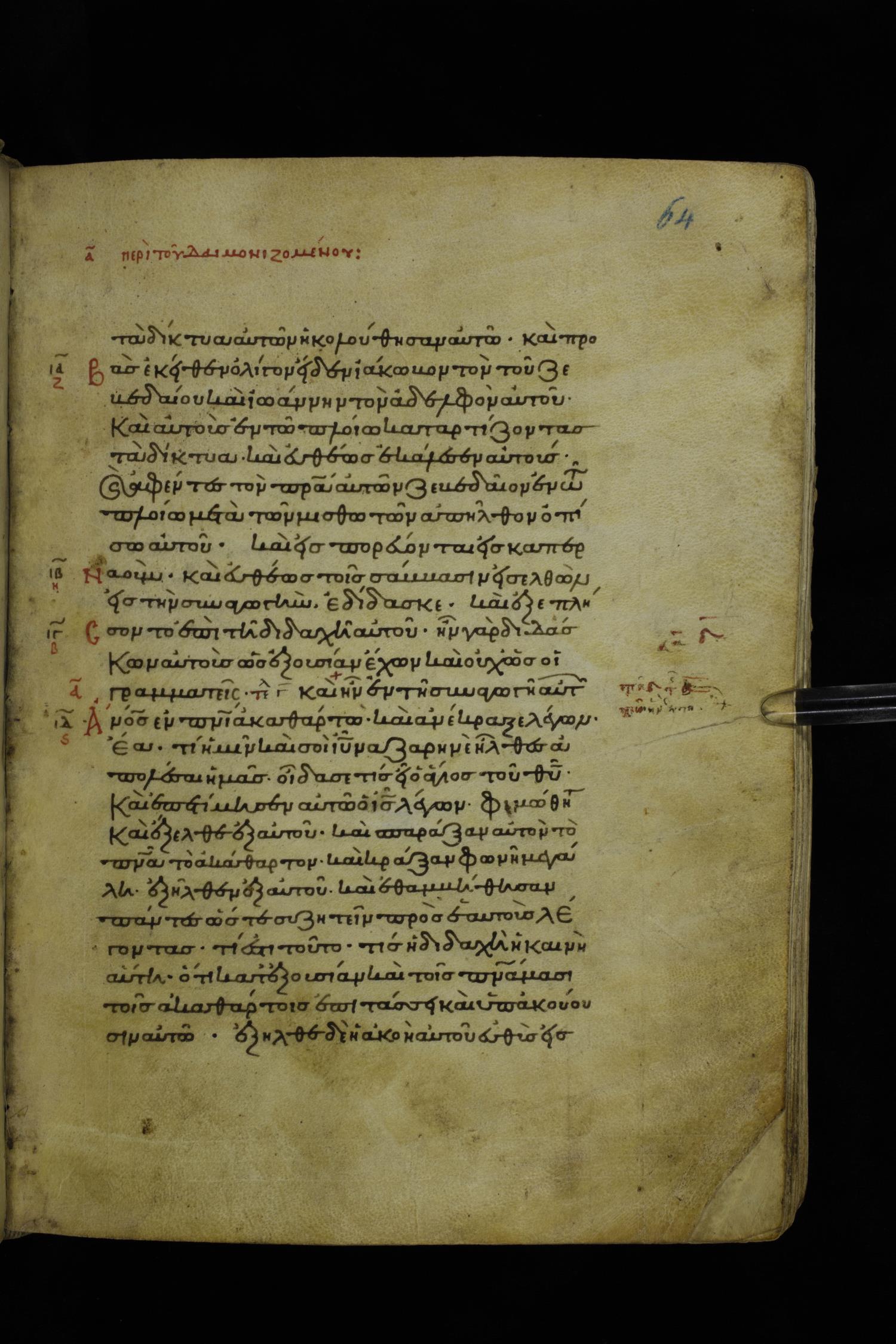 Twelfth century minuscule of the Gospels on parchment; 195 leaves, 1 column, 25 lines per column. Images were taken at the National Library of Greece in Athens.